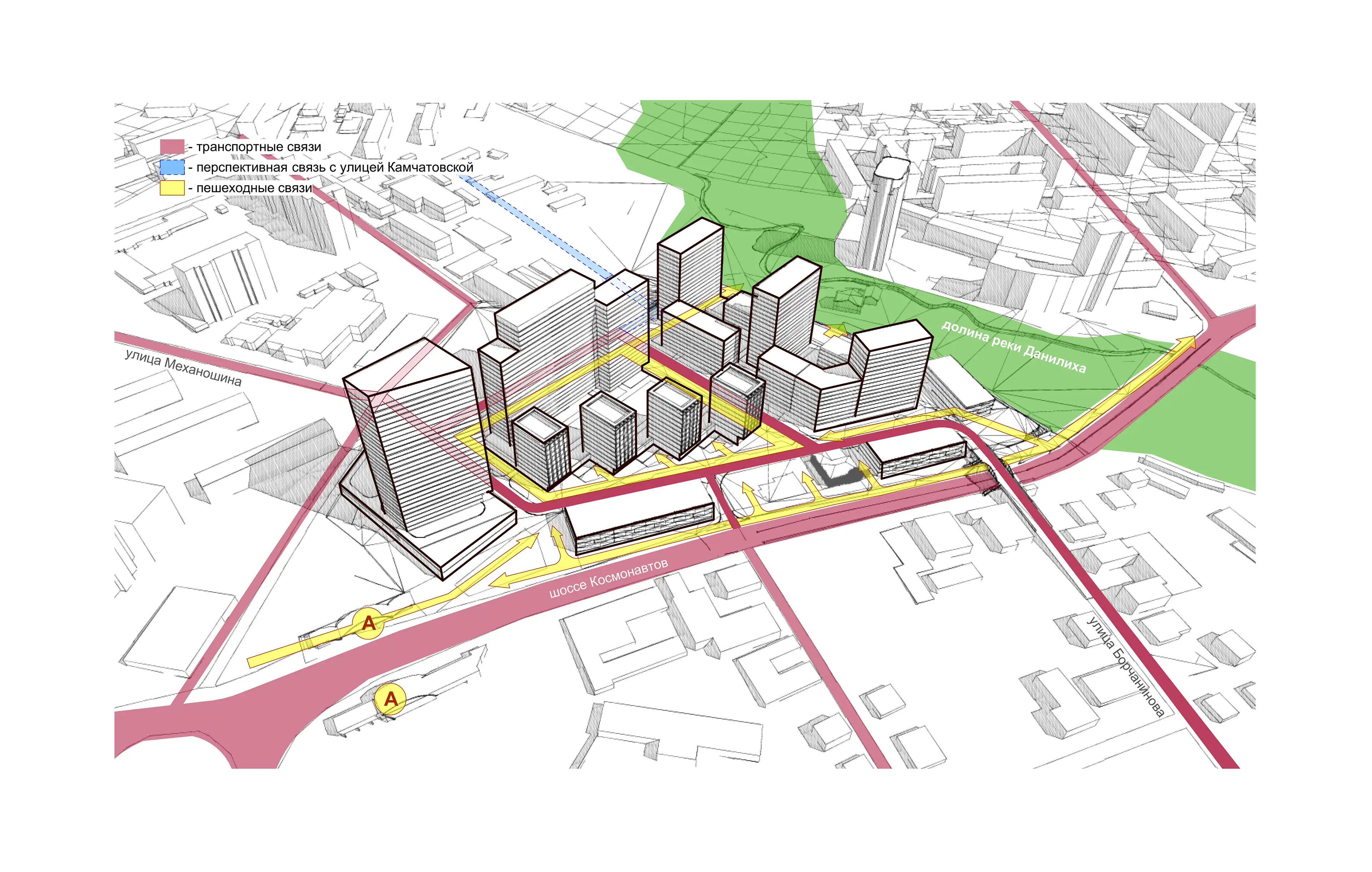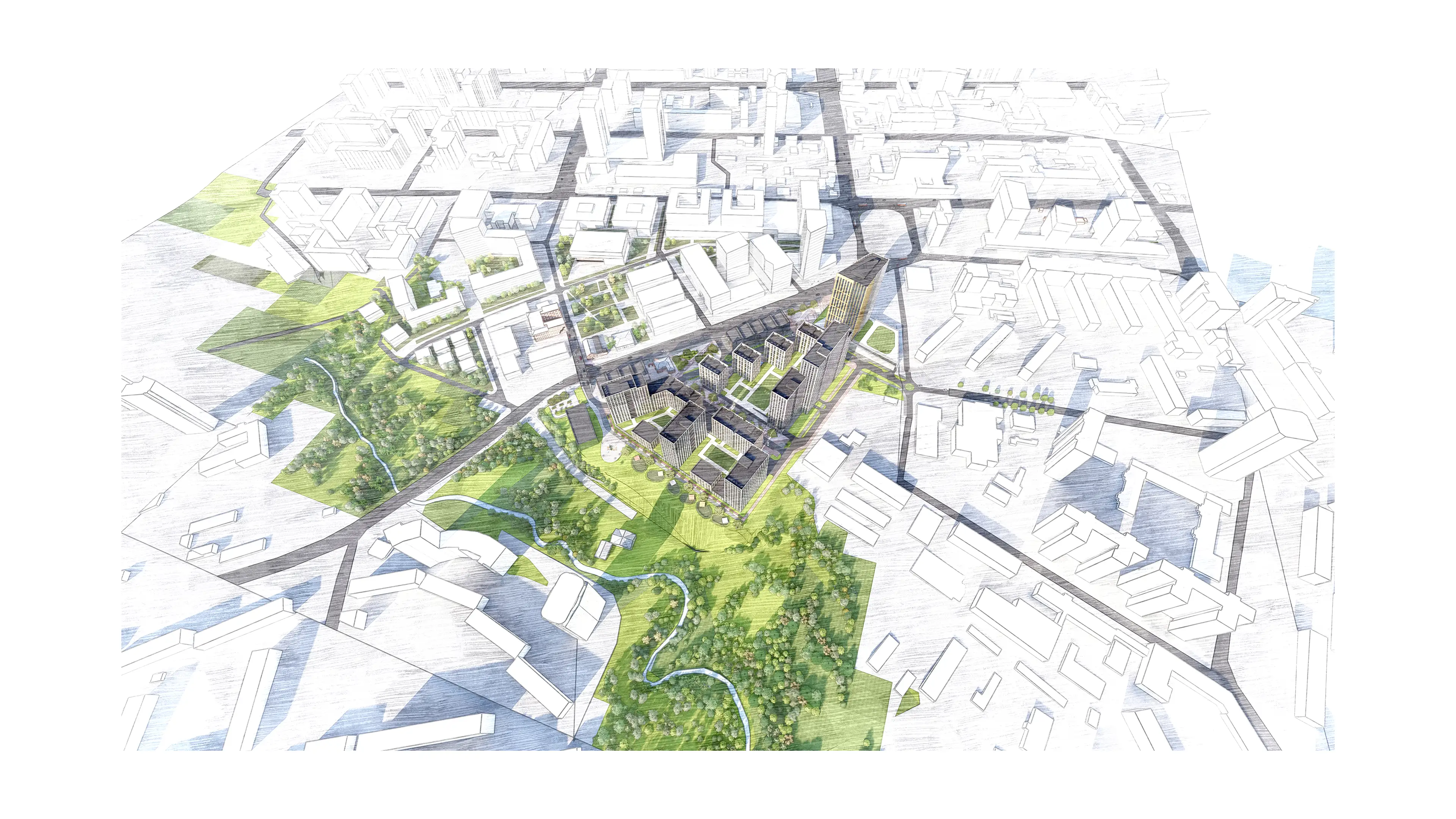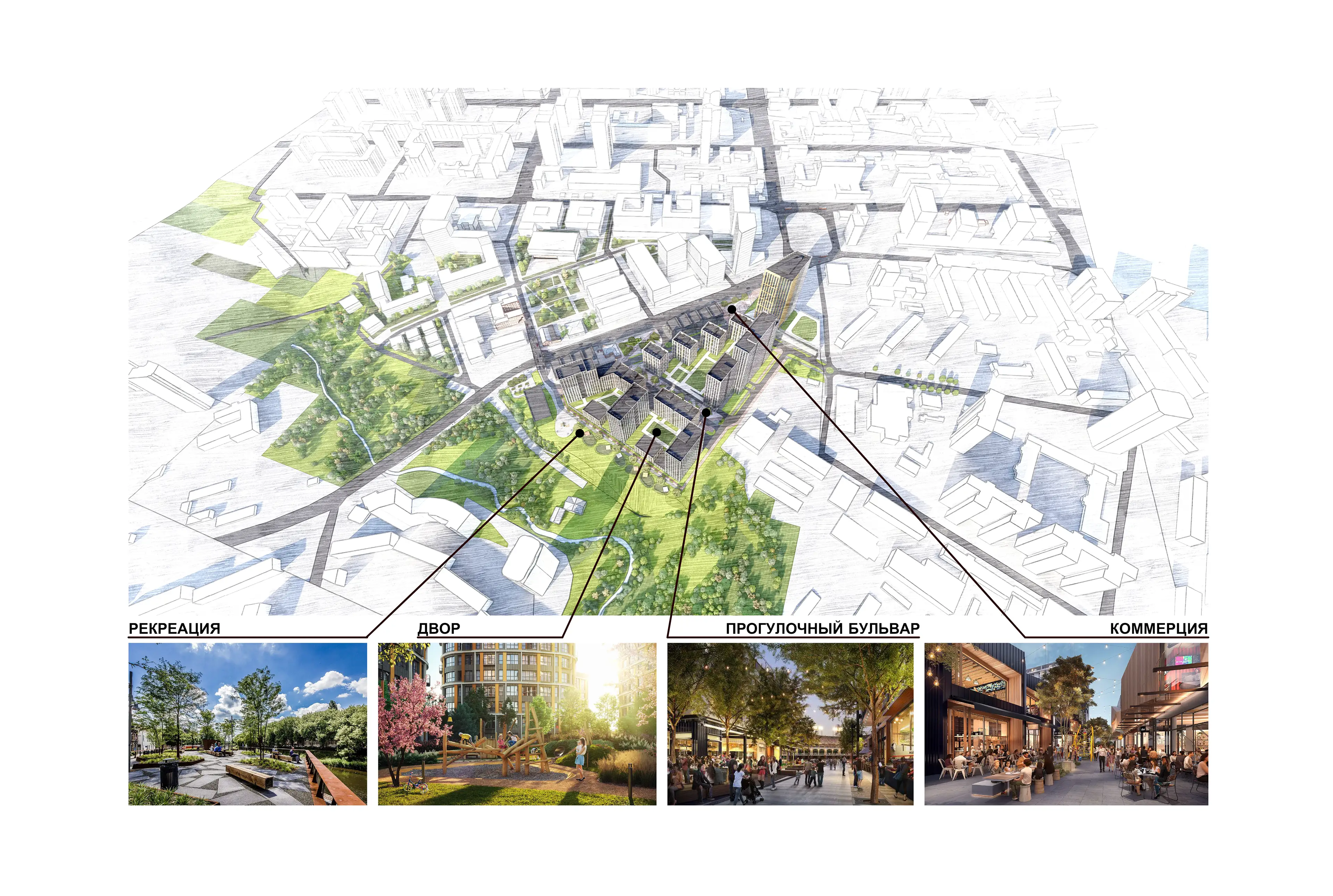 Архитектурная концепция застройки территории рынка "Гача". Площадка будет развиваться согласно нашей концепции с точки зрения идеи застройки, компоновки зданий, этажности, улично-дорожной сети.