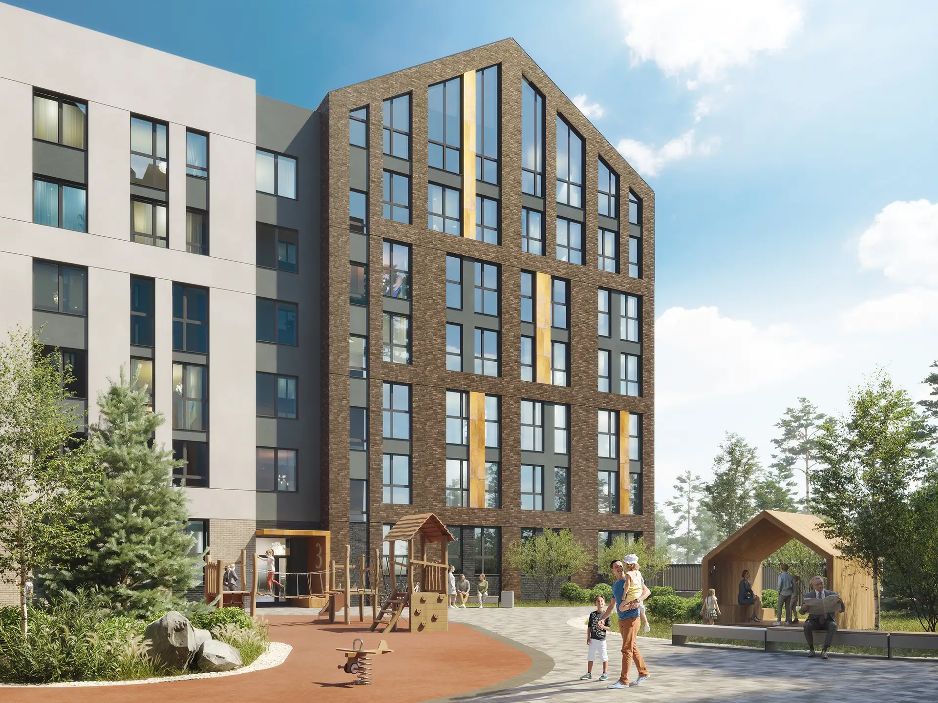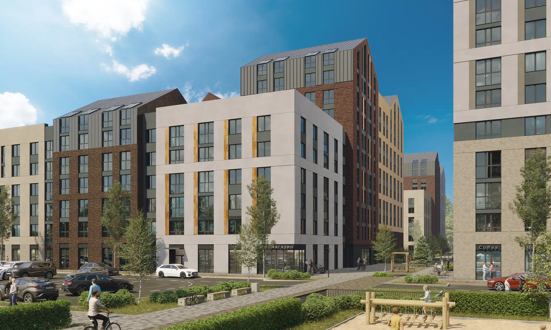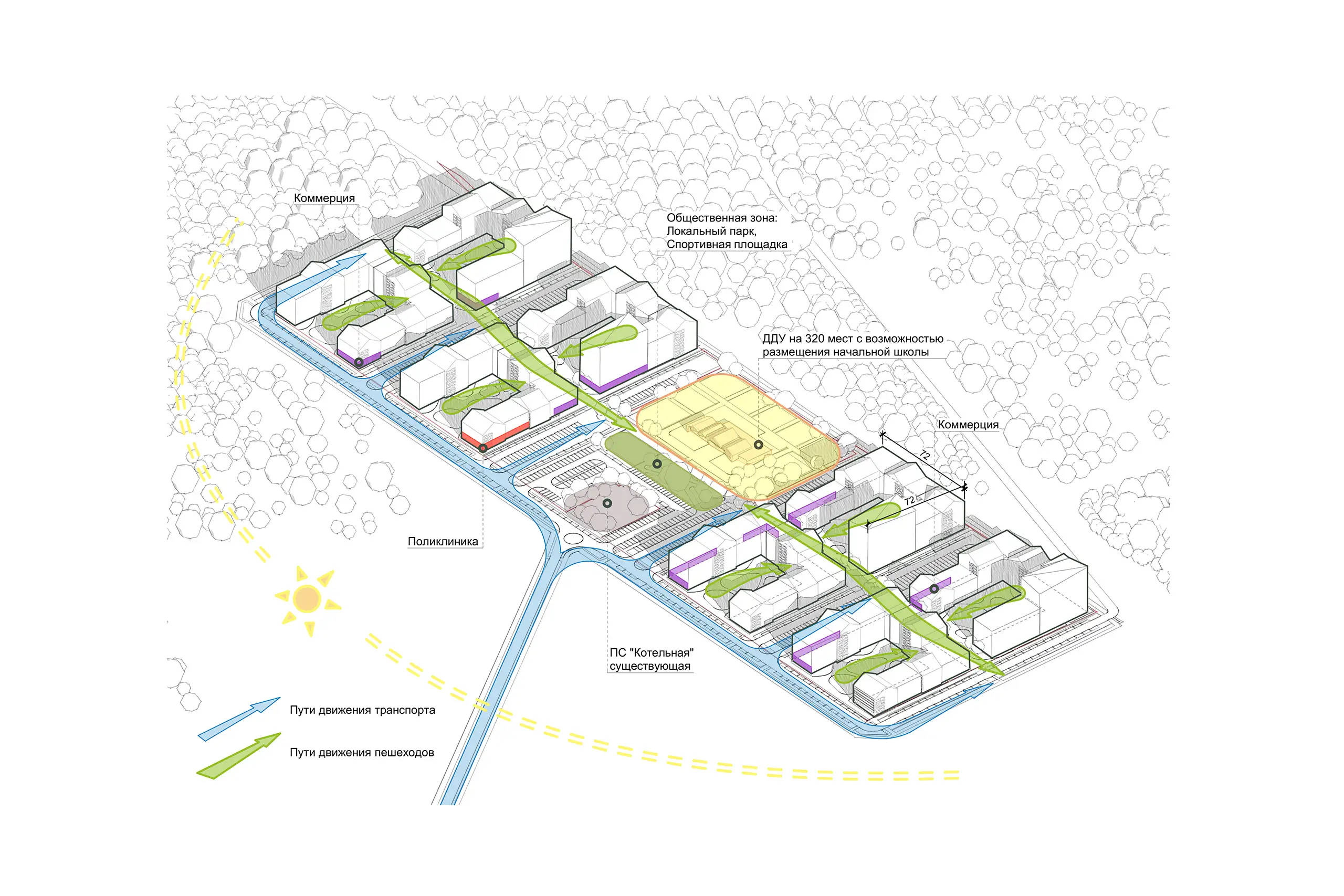 Концепция жилой застройки на ул. Спешилова формирует вытянутый городской квартал между ландшафтным парком и будущим образовательным кластером. Ряд домов высотой 6–16 этажей создают чёткий уличный фронт с активными первыми этажами. Внутри — локальный парк, детский сад на 320 мест и сеть пешеходно-веломаршрутов, которые связывают жилую среду с набережной и транспортным узлом.