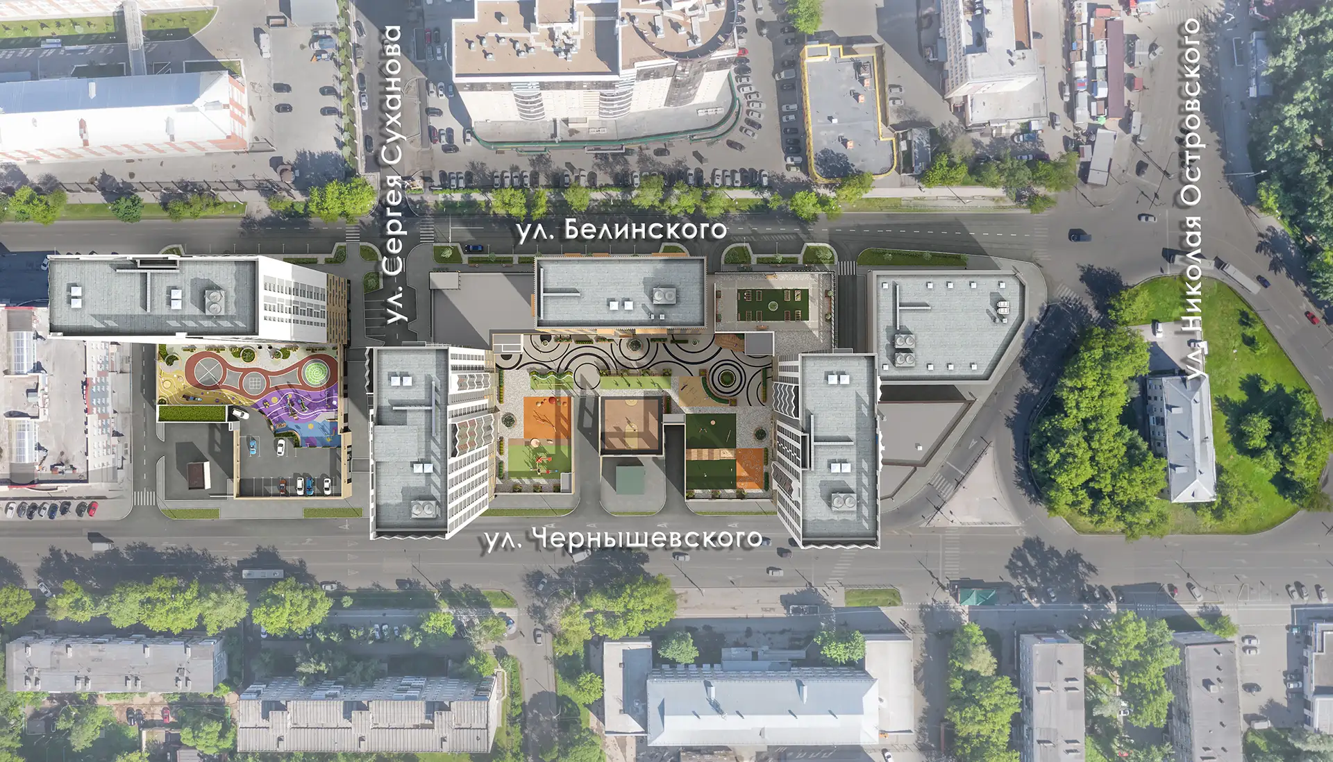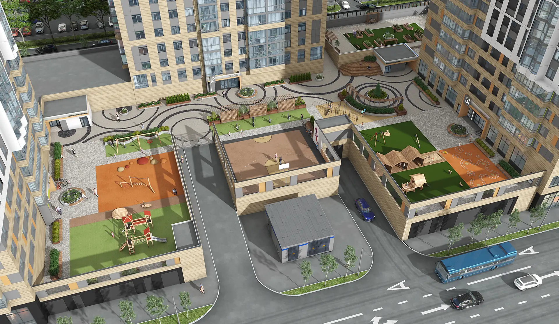 Зоны двора многофункциональны и распределены по возрасту. Для приватных зон отдыха разработаны индивидуальные беседки. Все зоны объединены ярким рисунком покрытия, которое также является элементом игры. Озеленение продумано по сезонам, есть место для однолетних растений, это позволит привносить новизну каждый сезон. Изюминкой является общественный огород — это не просто грядки, а важный элемент инфраструктуры, способствующий коммуникации между жильцами. Здесь, в дружеской атмосфере, за разговорами о садоводстве возникают новые знакомства и сообщества. Пропалывая клубнику или обсуждая особенности ухода за растениями, жители могут отвлечься от городской суеты и насладиться кусочком природы прямо во дворе своего дома.