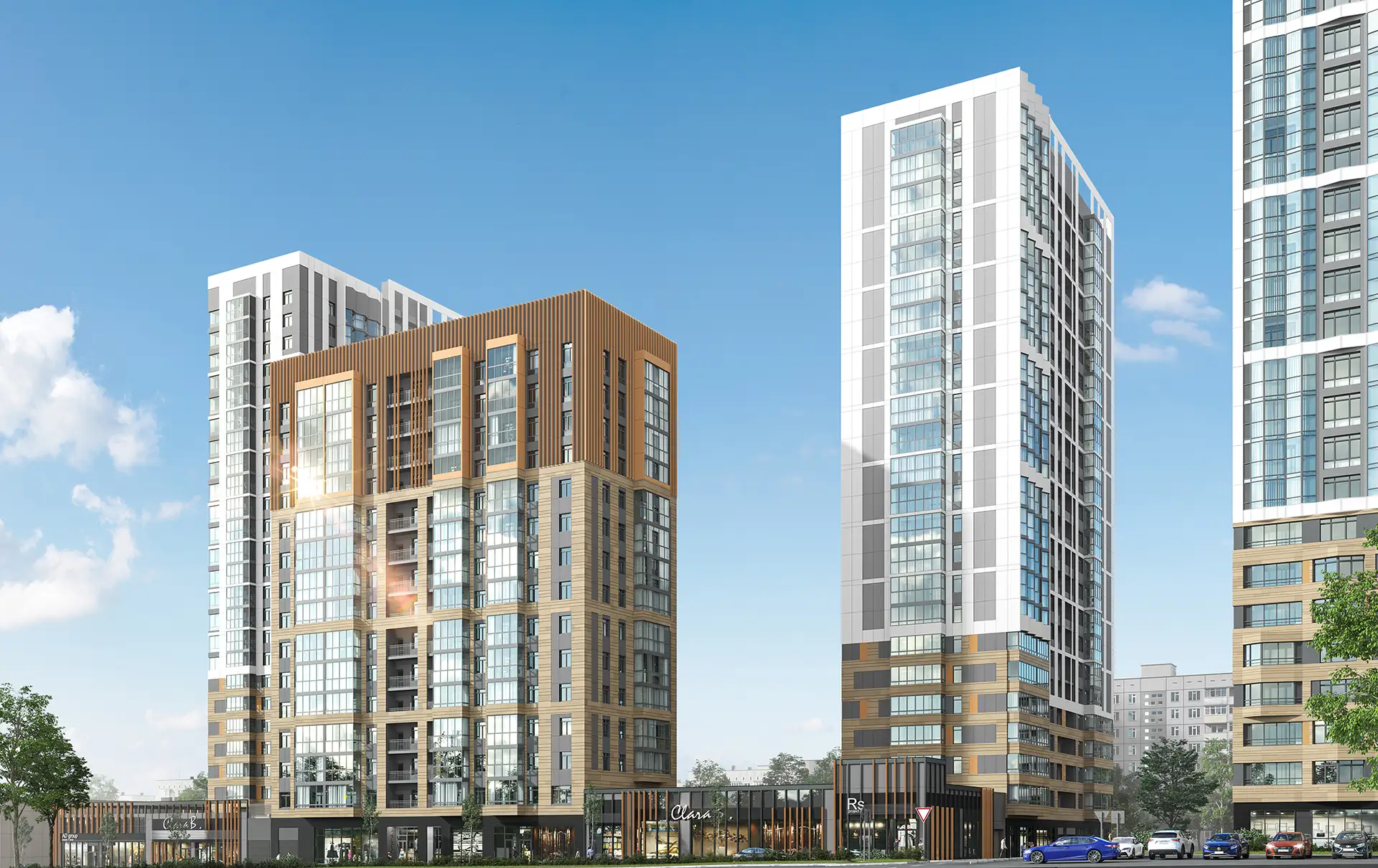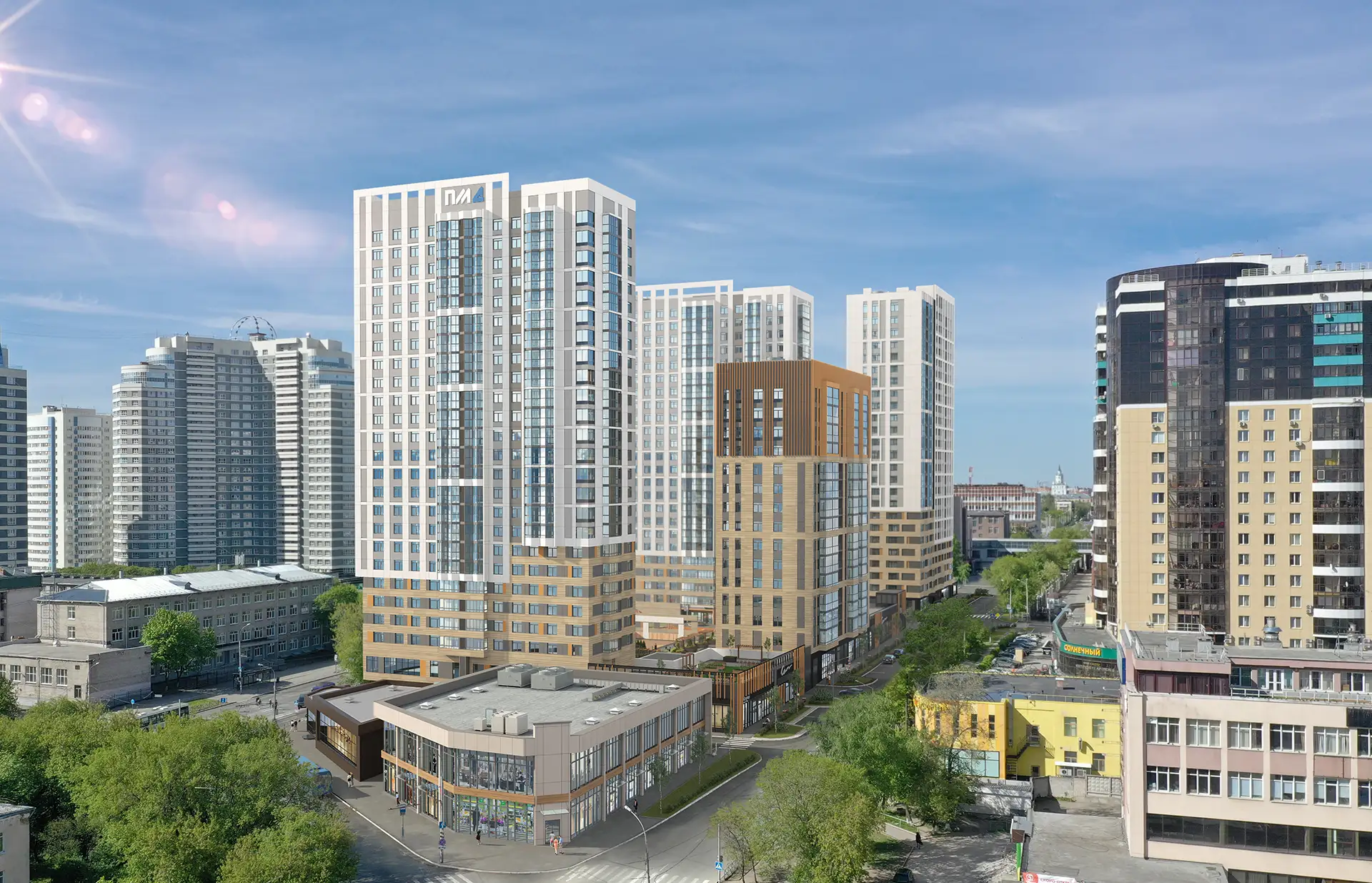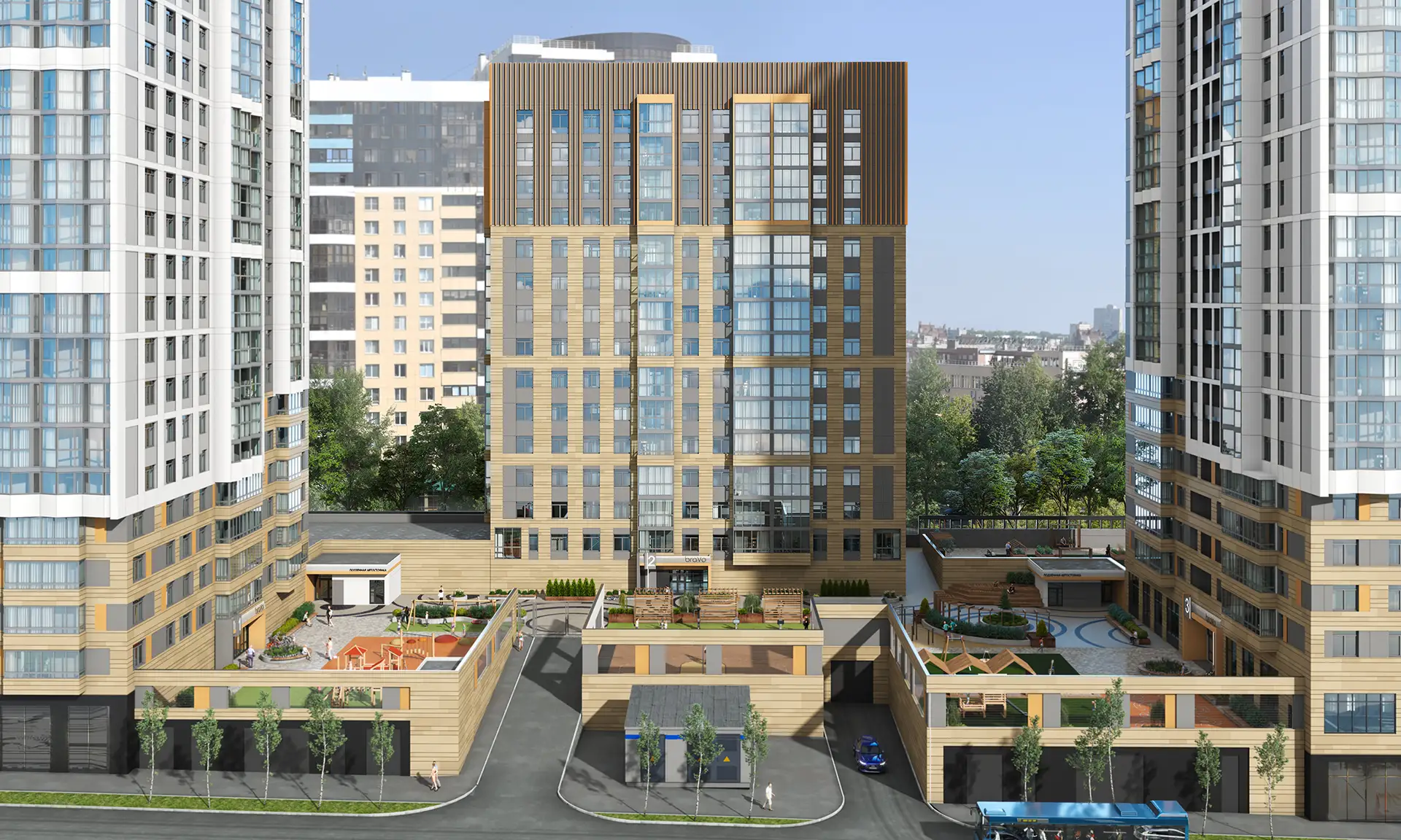 Квартал расположен в динамичной части города с развитой инфраструктурой, в стесненной городской застройке. Нашей задачей стояло сделать двор приватным и безопасным, огородить жильцов от шумных улиц. Таким образом двор поднят на стилобат в уровень второго этажа, а первый этаж предназначен для коммерции и автостоянки.