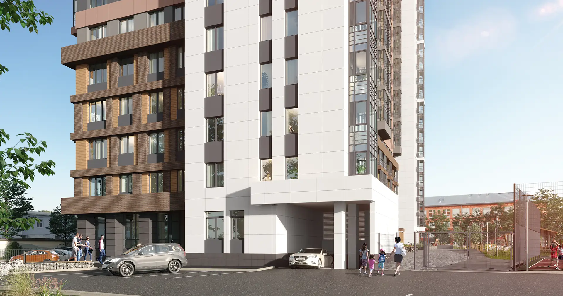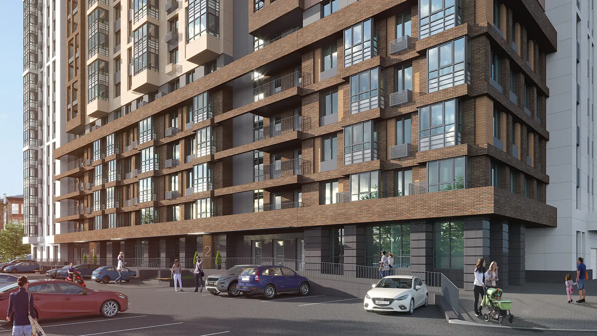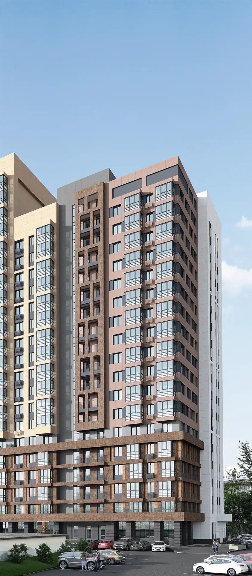 Двухсекционный многоквартирный жилой дом со встроенными помещениями многофункционального назначения и подземной автостоянкой.