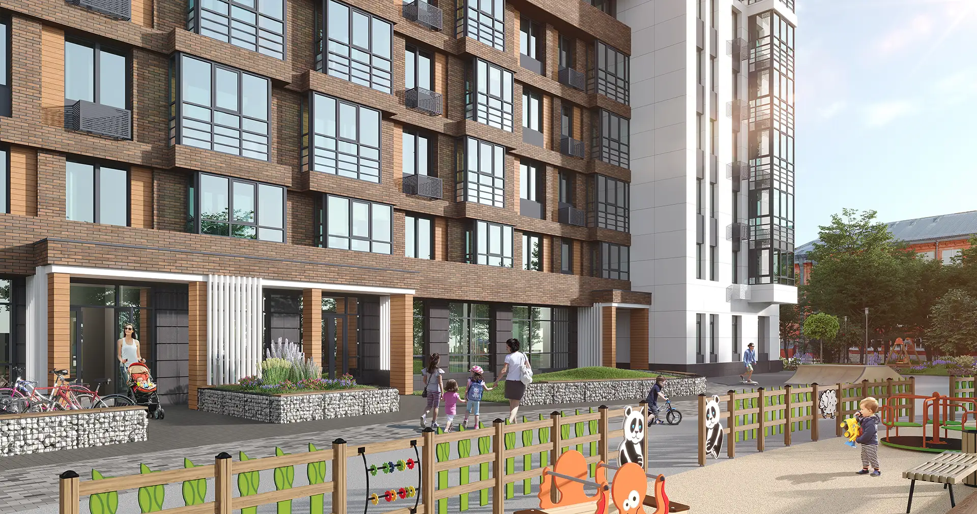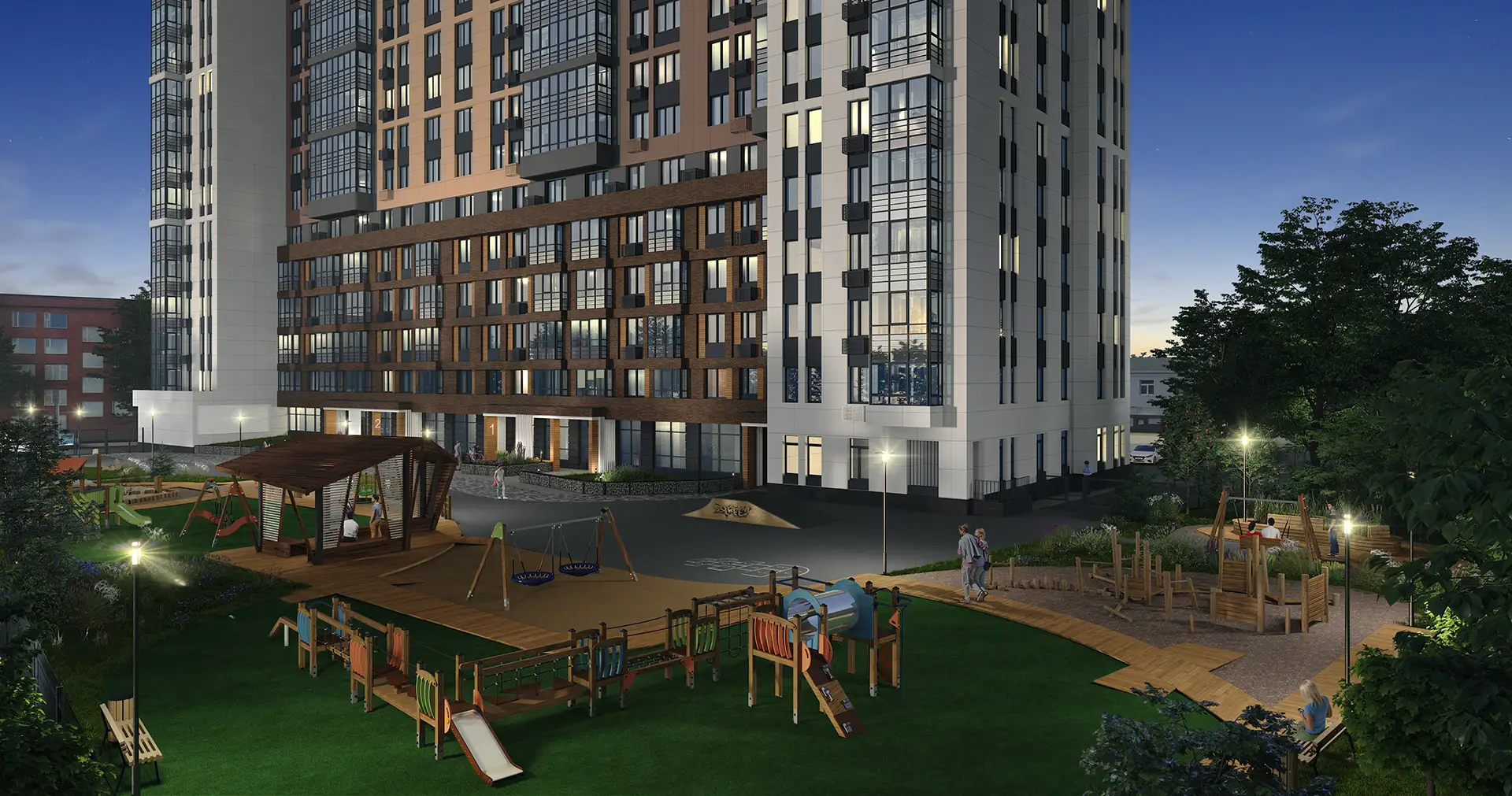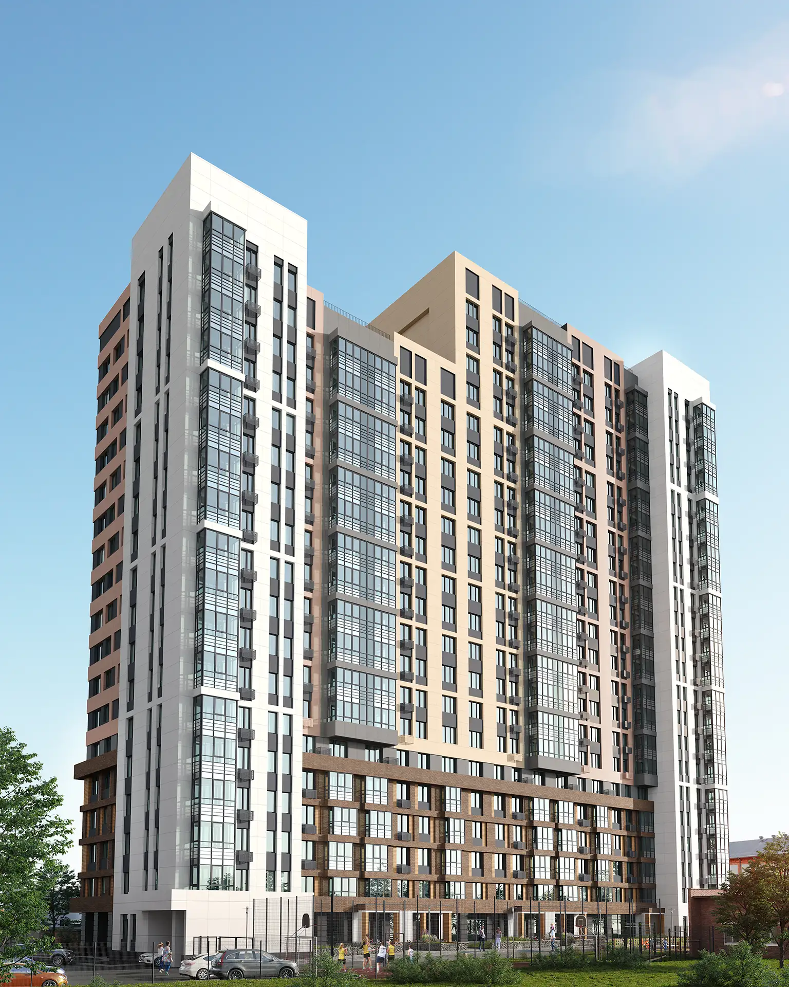 Двухсекционный многоквартирный жилой дом со встроенными помещениями многофункционального назначения и подземной автостоянкой.