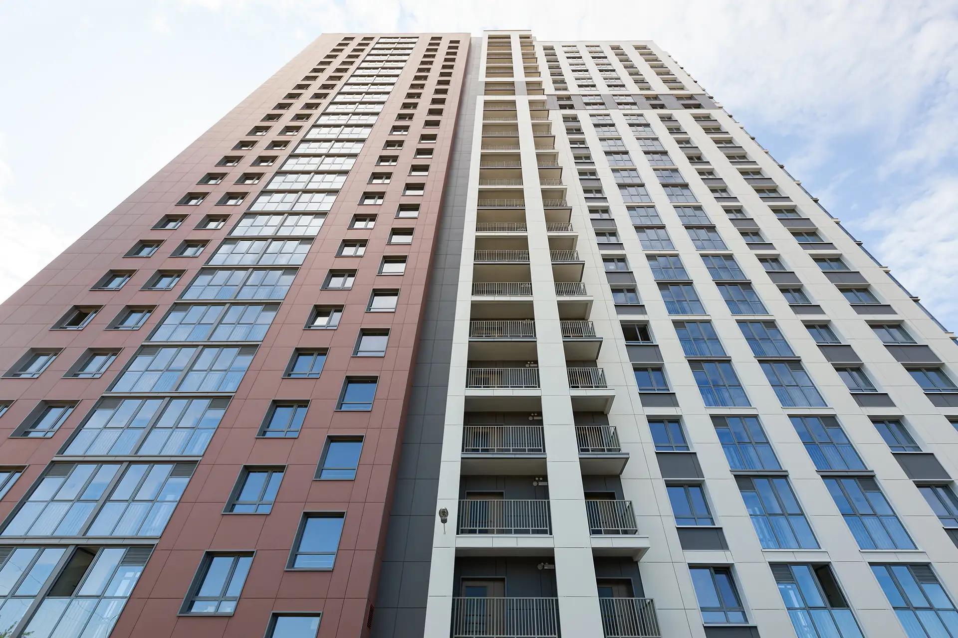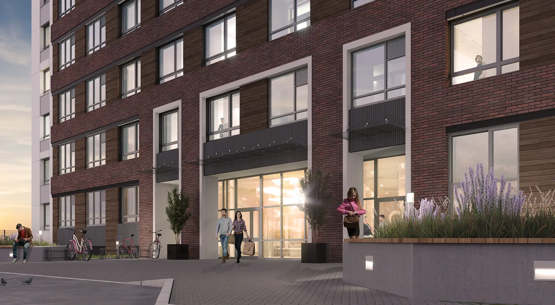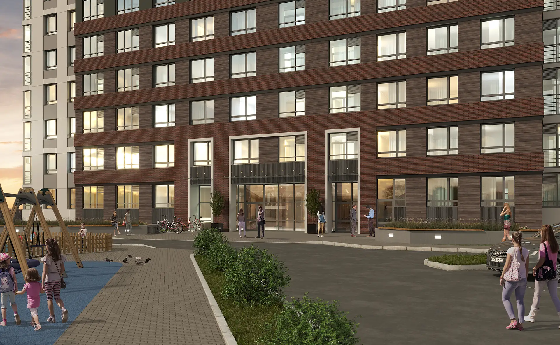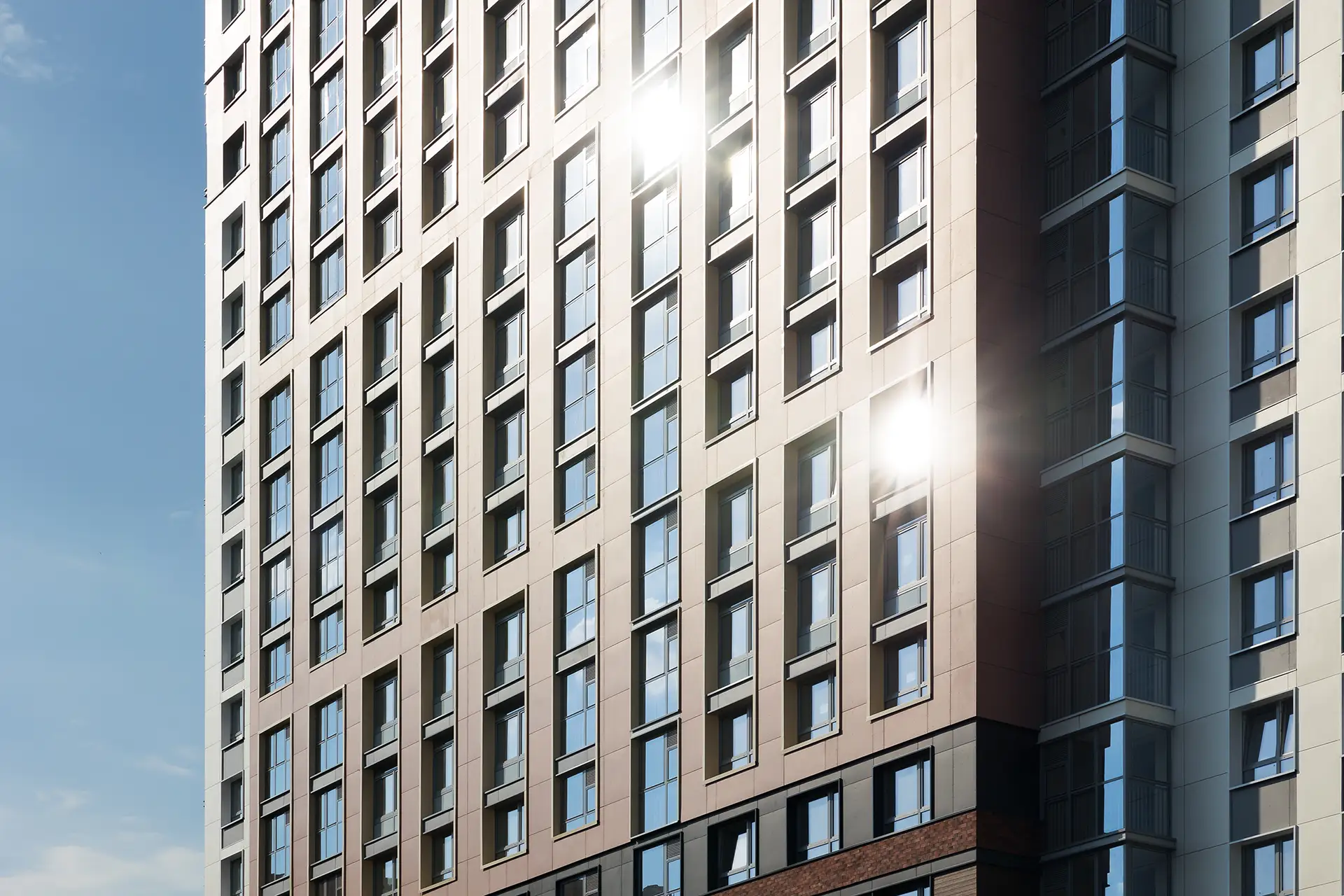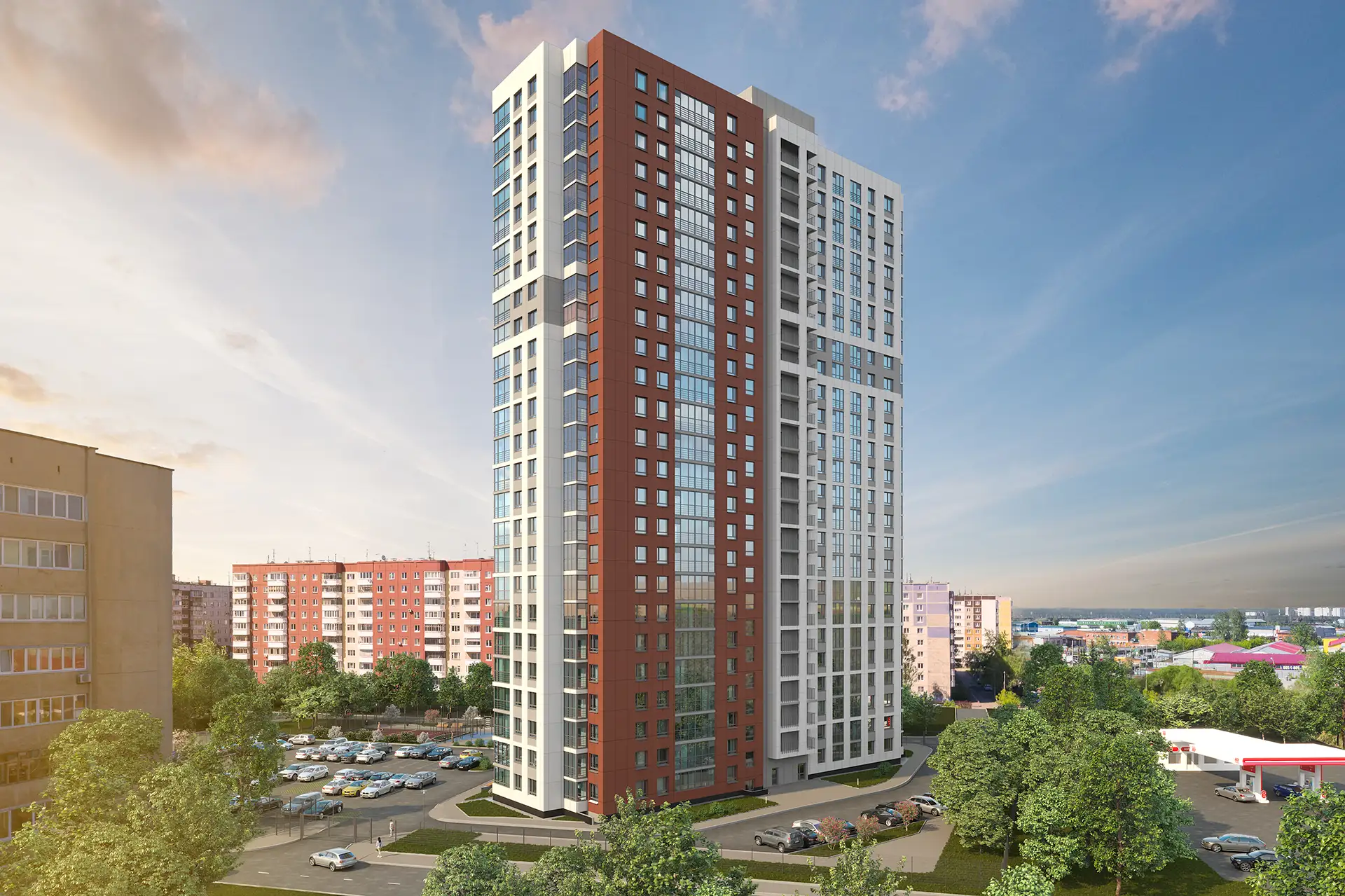 Компактный односекционный объём читается как три вертикали: терракотовый центр собирает силуэт, светлые боковые части формируют пропорции и задают ясный контраст. Для более приятного восприятия архитектуры человеком первые пять этажей облицованы декоративным материалом «под кирпич» с деревянными вставками.