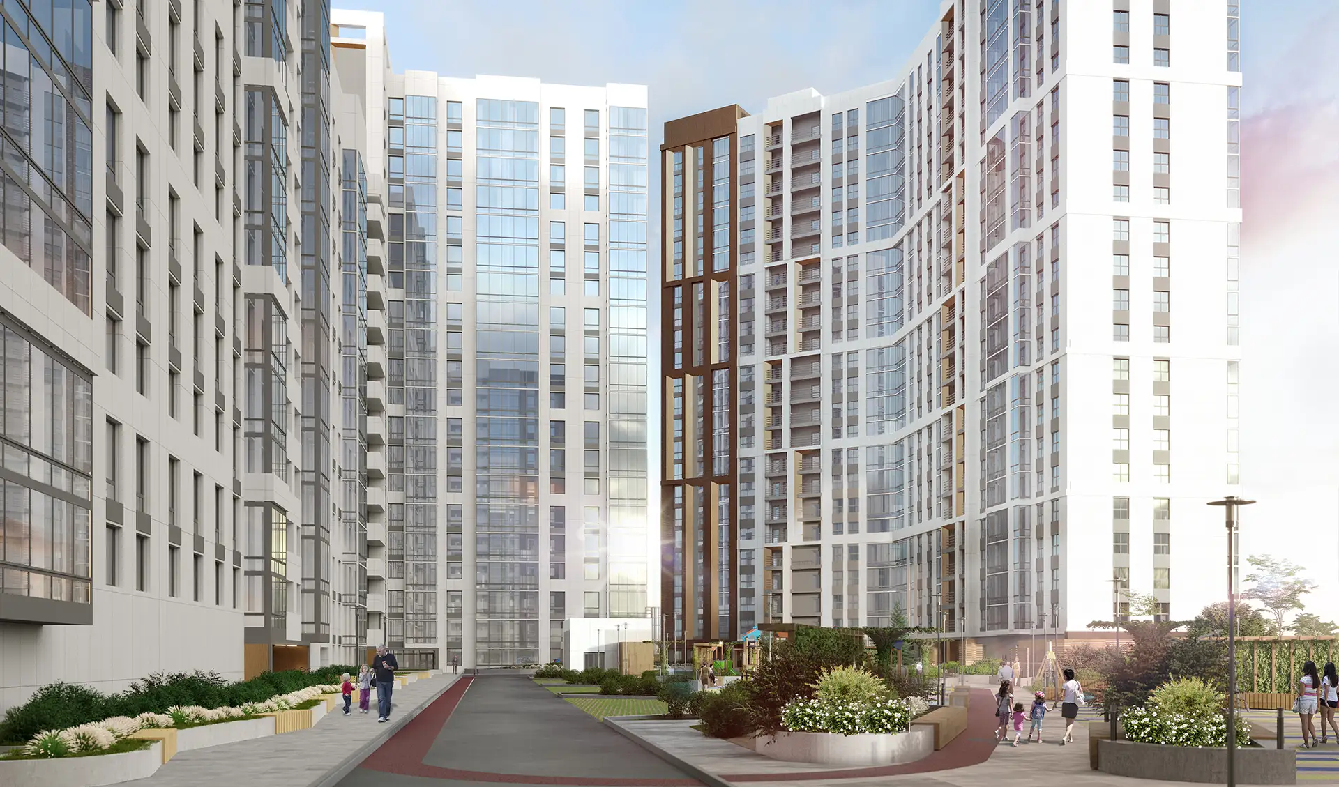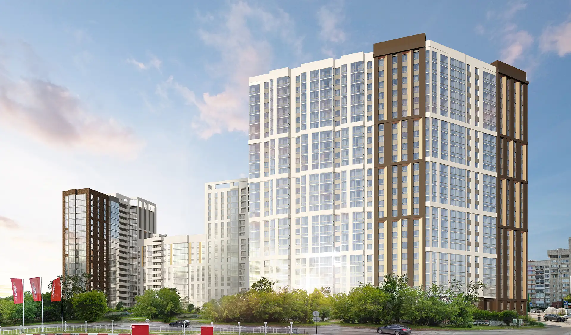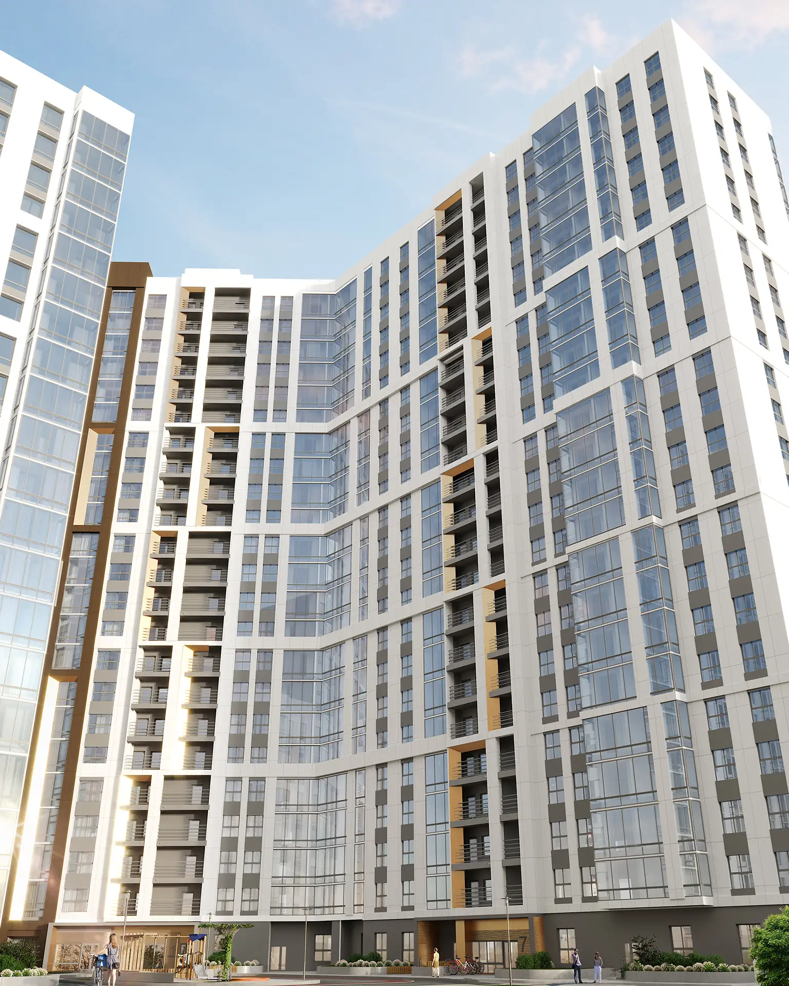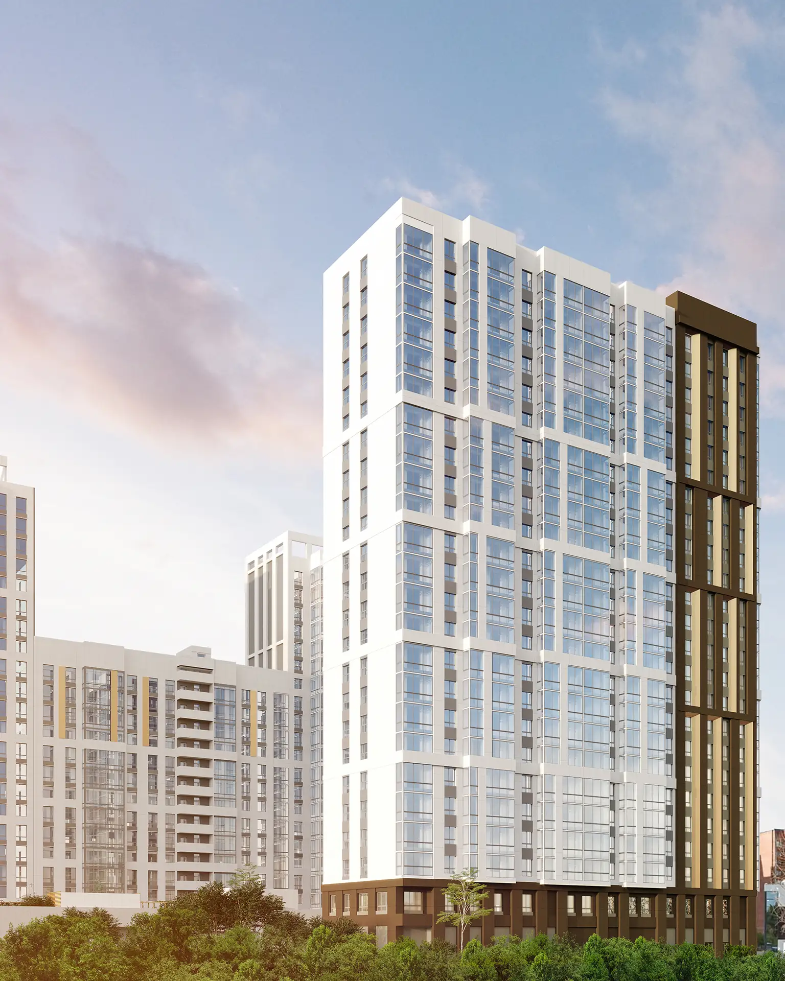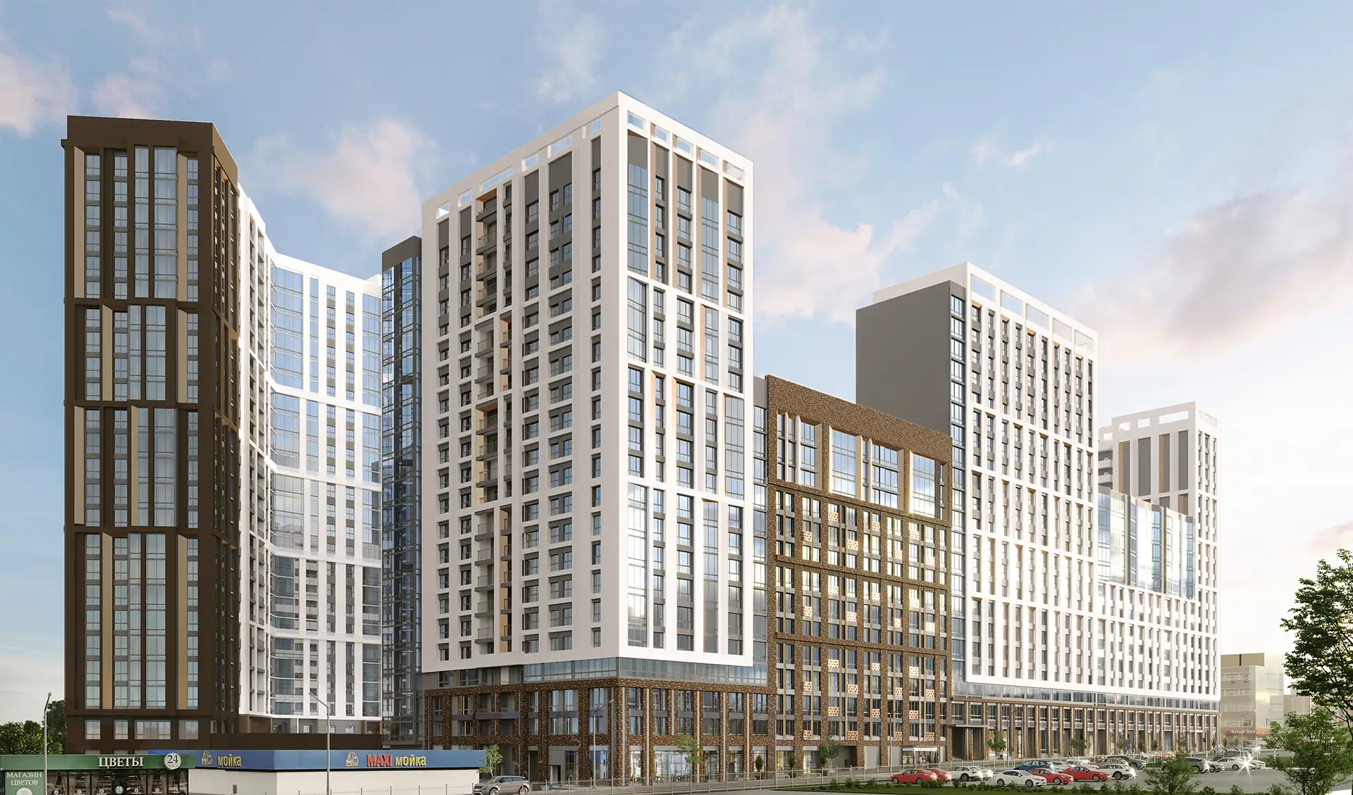 В рамках данного проекта разработаны фасадные решения и благоустройство дворового пространства для комплекса многоквартирных жилых домов.