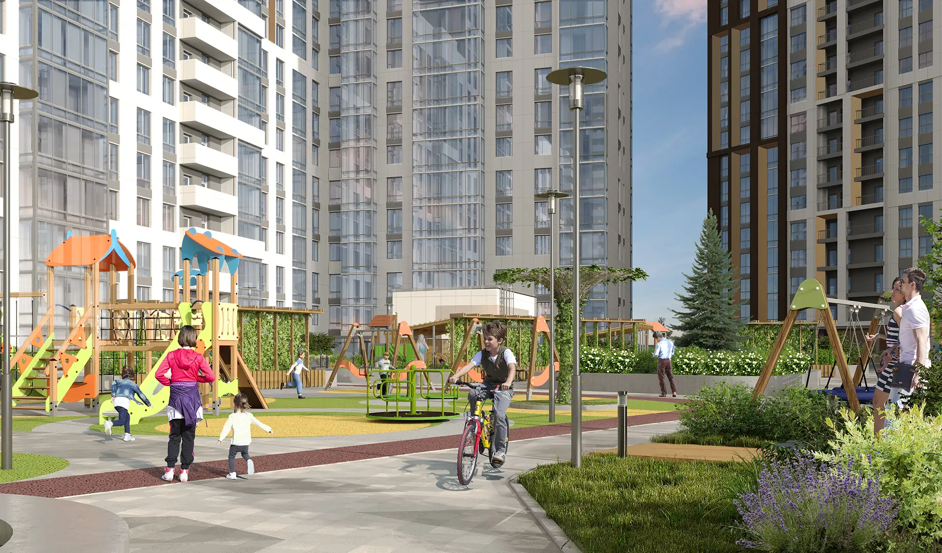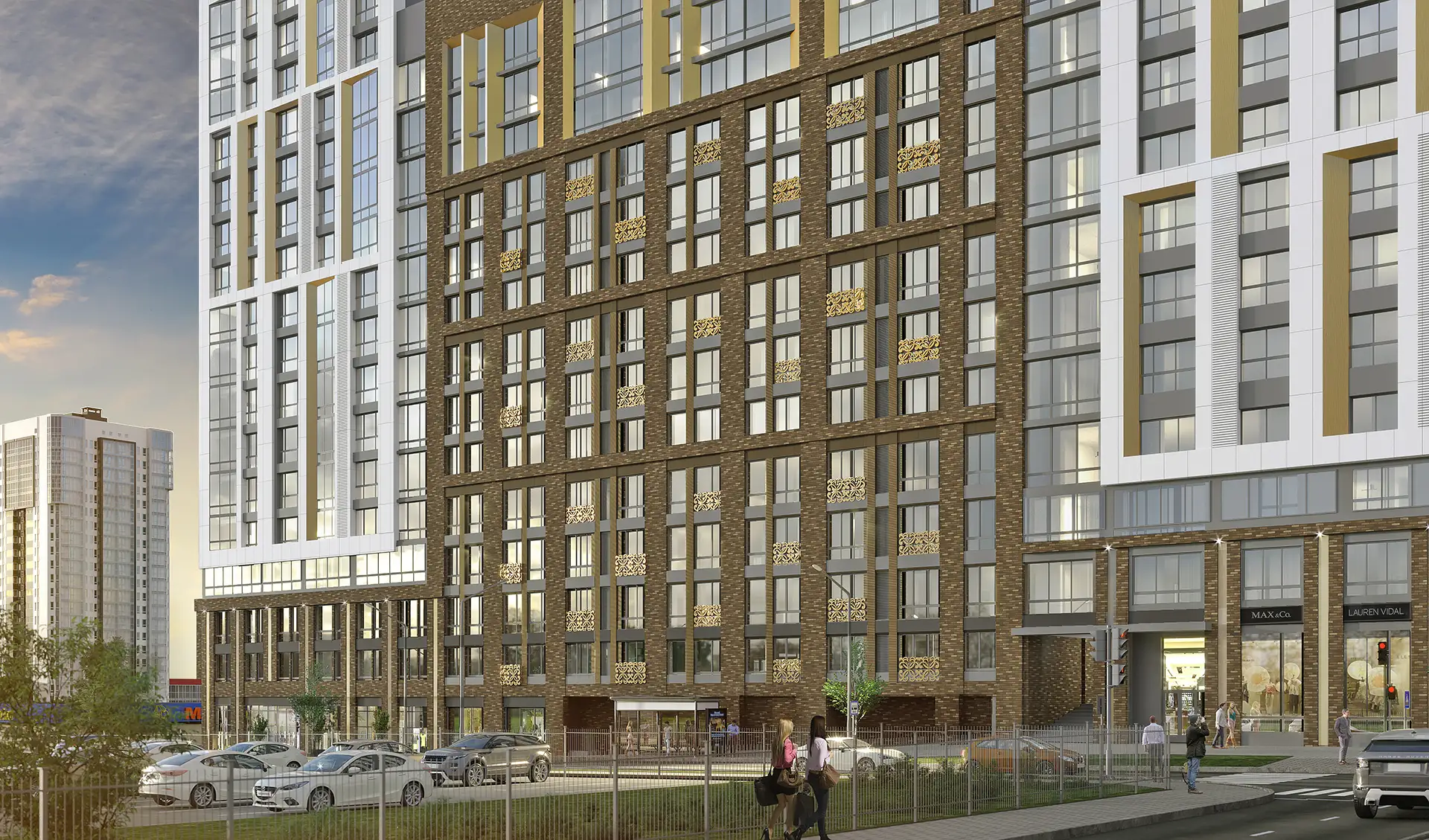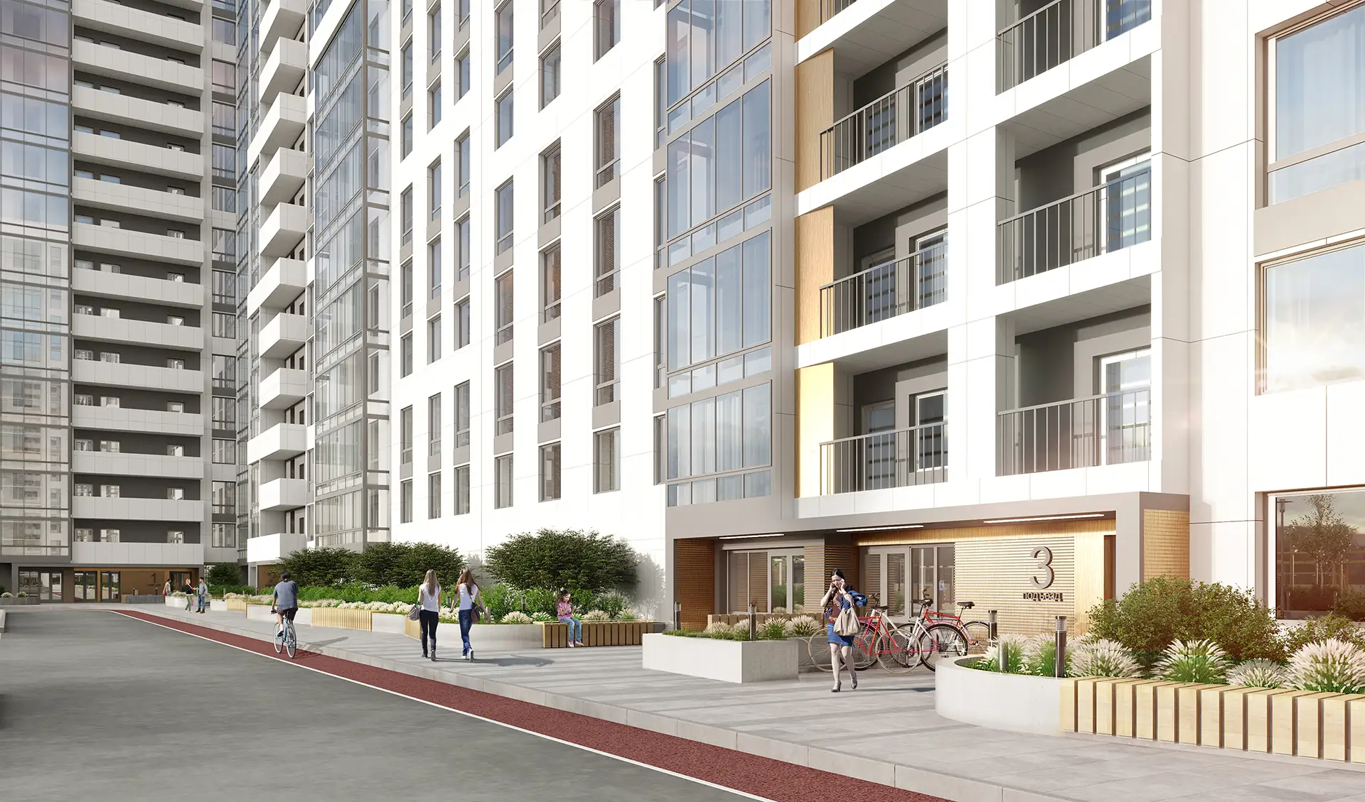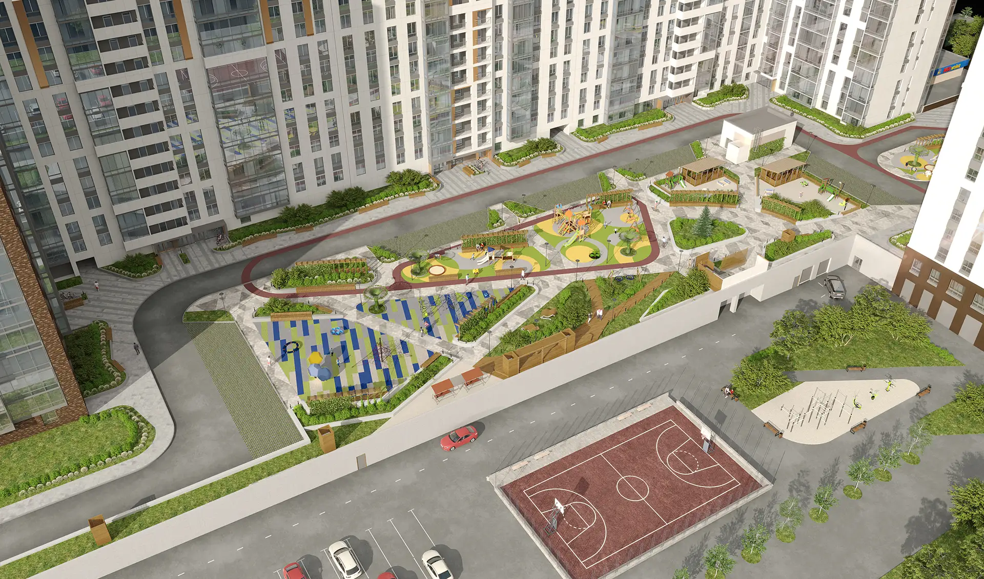 В рамках данного проекта разработаны фасадные решения и благоустройство дворового пространства для комплекса многоквартирных жилых домов.