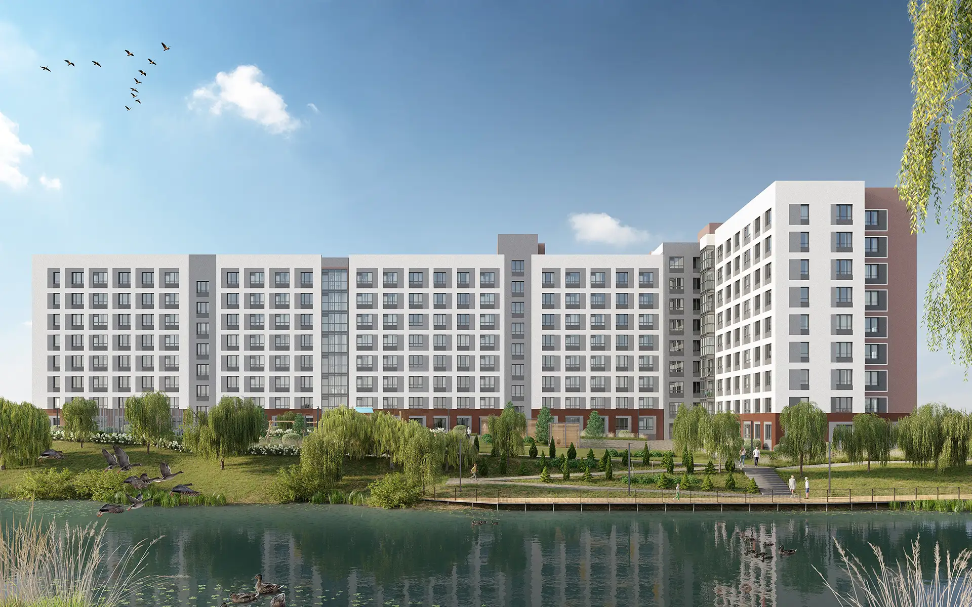 Первая очередь расположена у воды — здесь тишина, уточки, солнечные блики на воде и зелень вокруг.