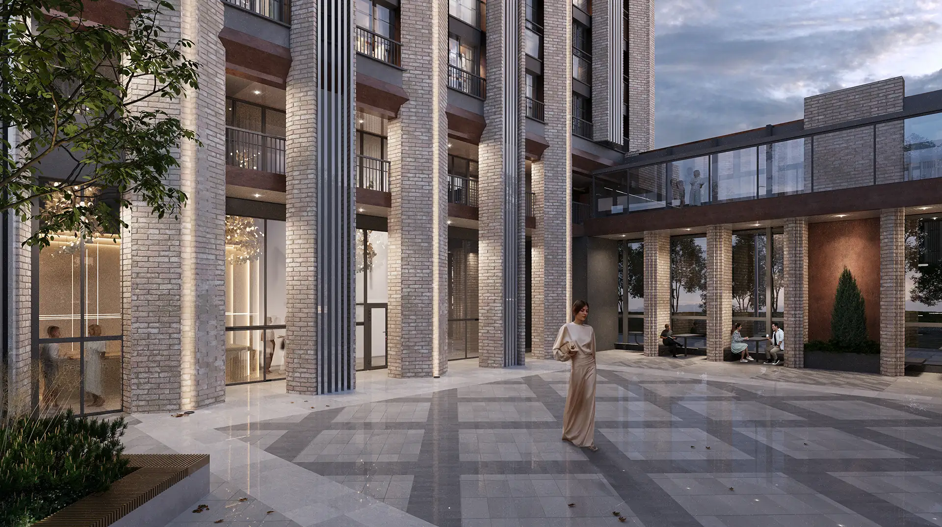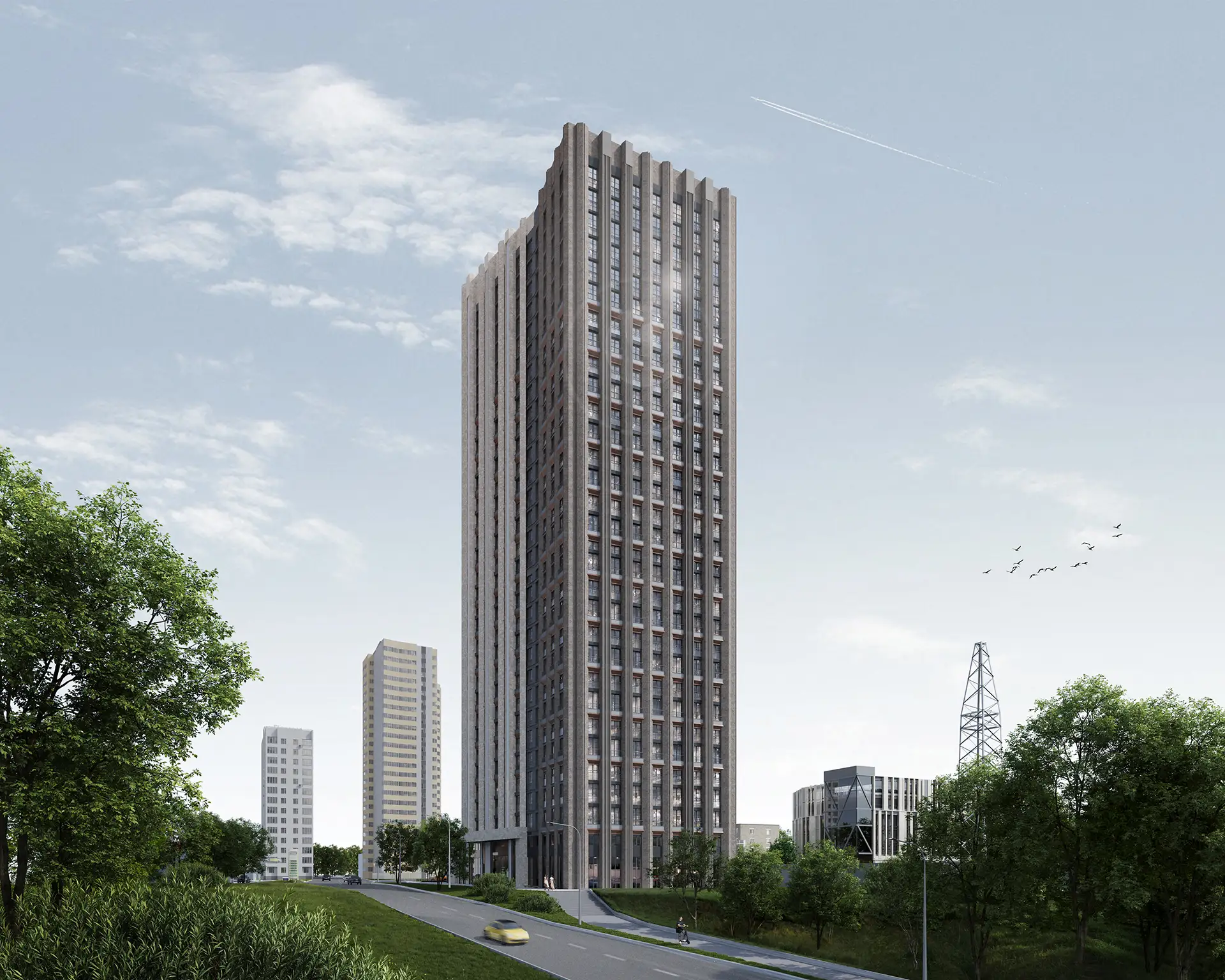 Жилой комплекс композиционно завершает силуэт городского центра в панораме города с реки.