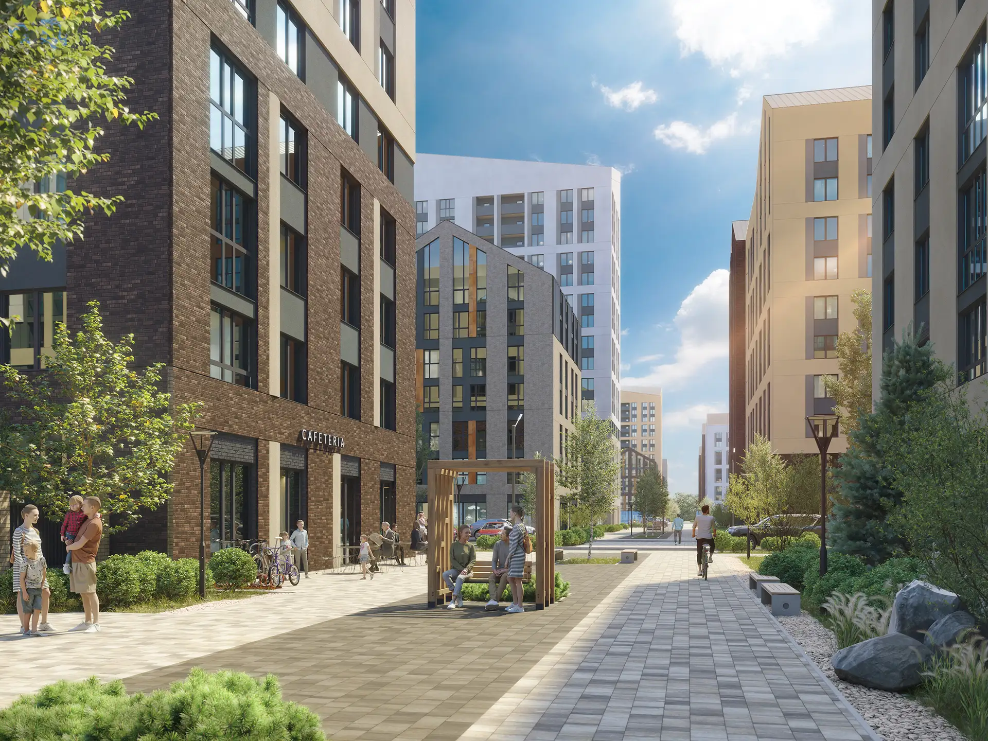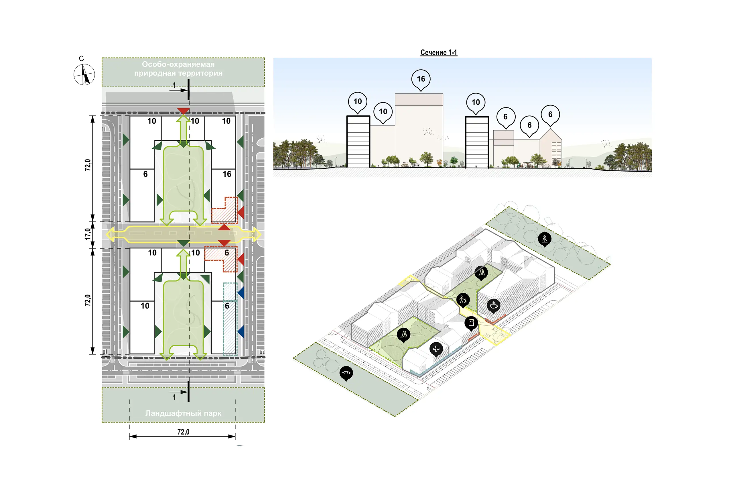 Концепция жилой застройки на ул. Спешилова формирует вытянутый городской квартал между ландшафтным парком и будущим образовательным кластером. Ряд домов высотой 6–16 этажей создают чёткий уличный фронт с активными первыми этажами. Внутри — локальный парк, детский сад на 320 мест и сеть пешеходно-веломаршрутов, которые связывают жилую среду с набережной и транспортным узлом.