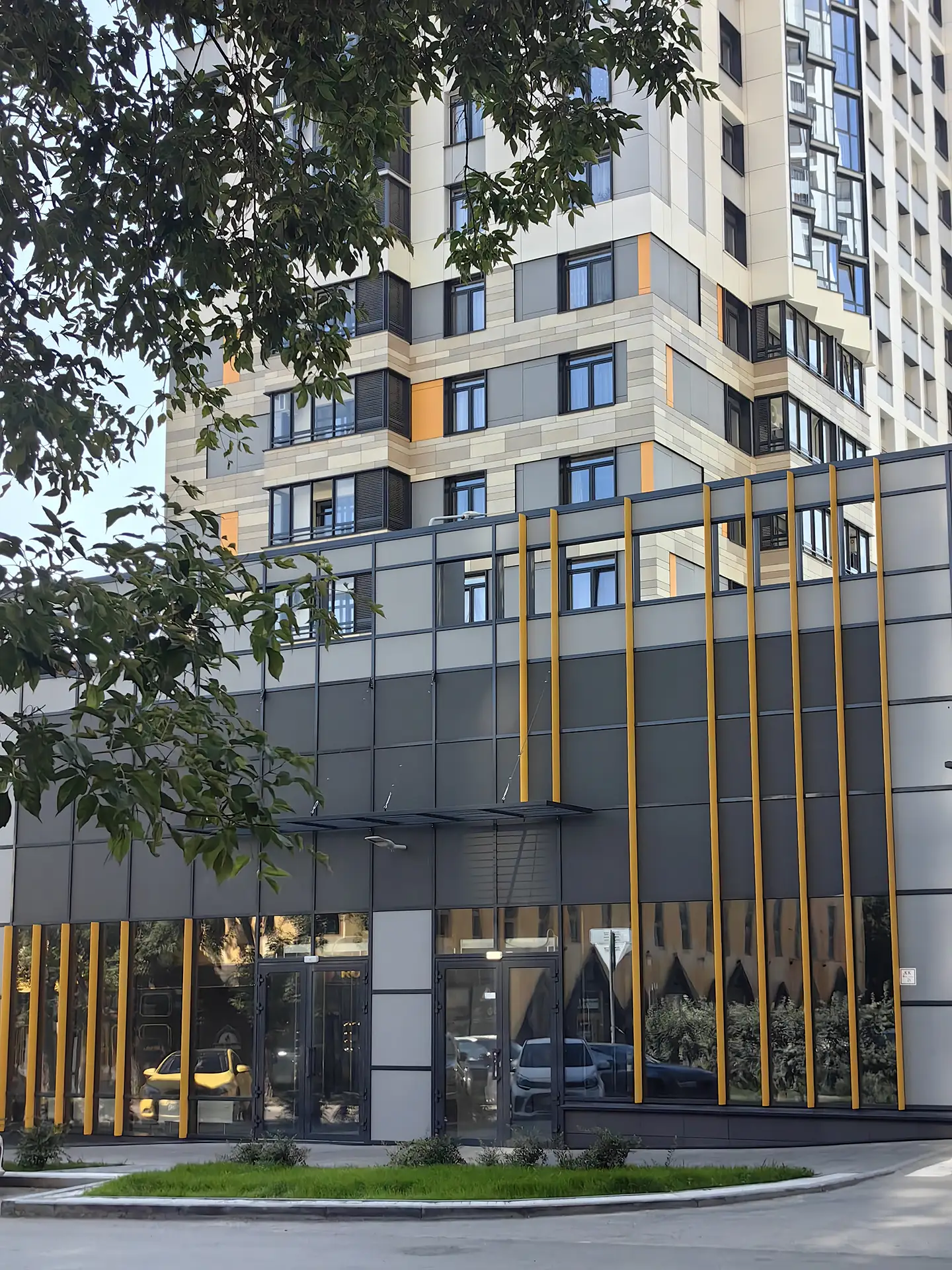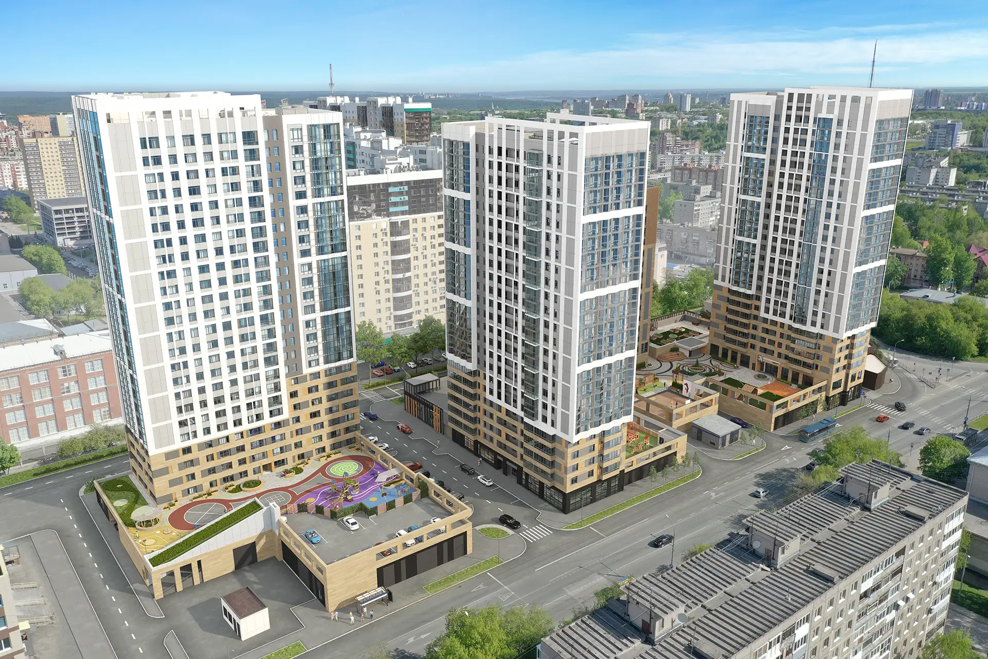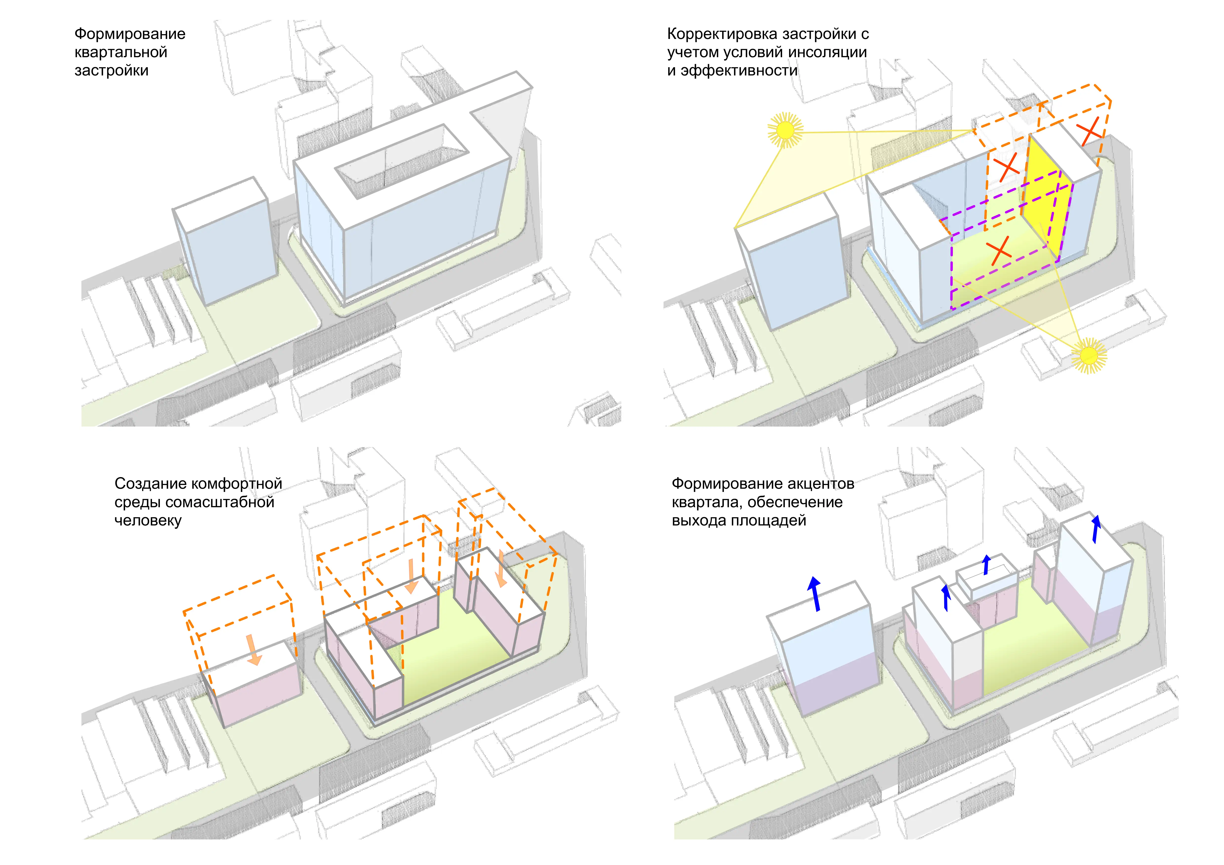 Квартал расположен в динамичной части города с развитой инфраструктурой, в стесненной городской застройке. Нашей задачей стояло сделать двор приватным и безопасным, огородить жильцов от шумных улиц. Таким образом двор поднят на стилобат в уровень второго этажа, а первый этаж предназначен для коммерции и автостоянки.