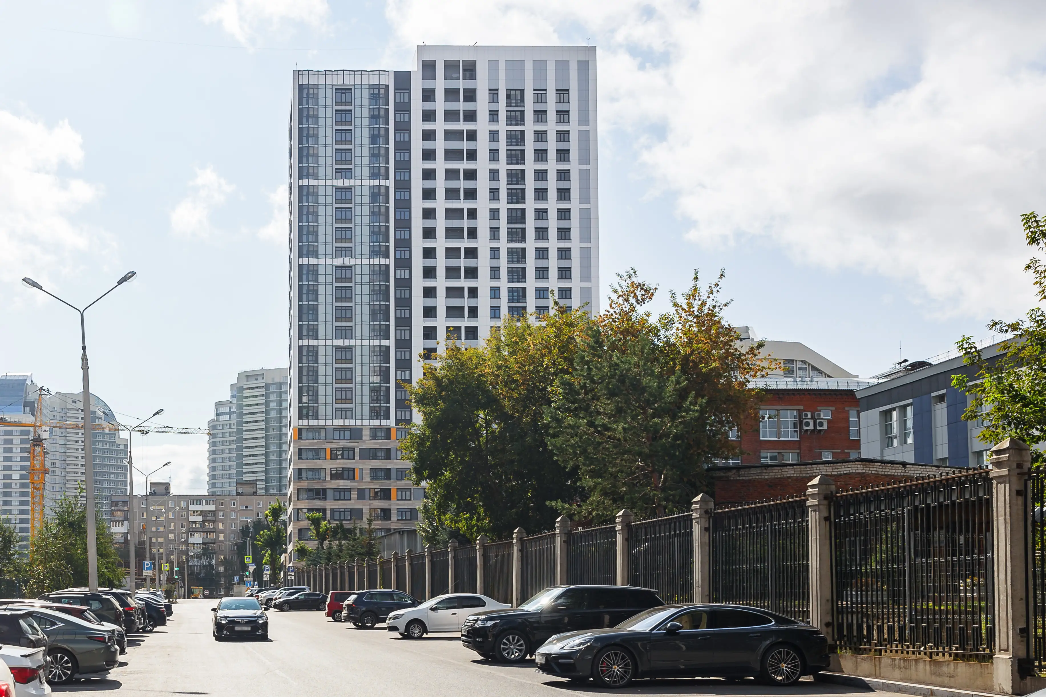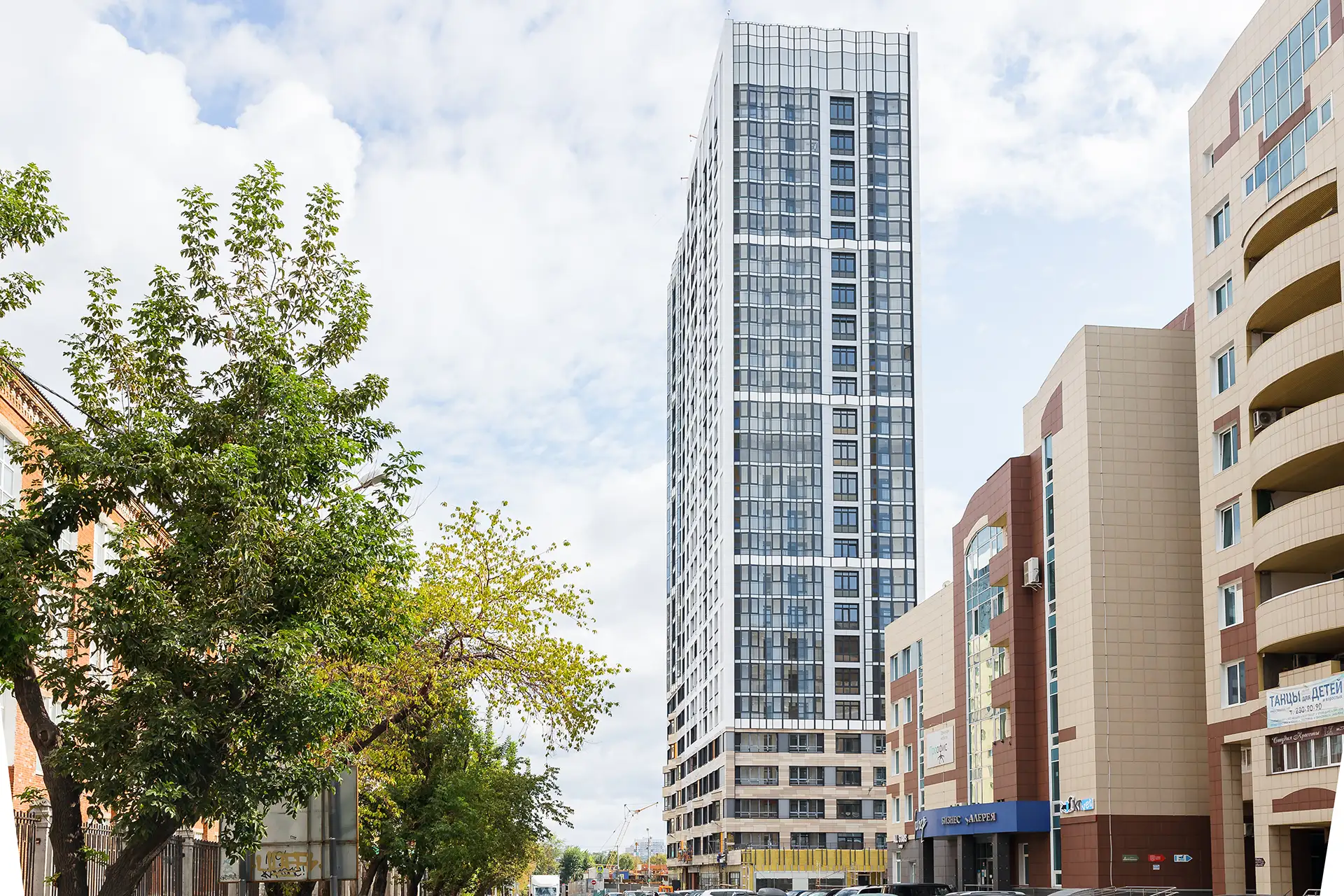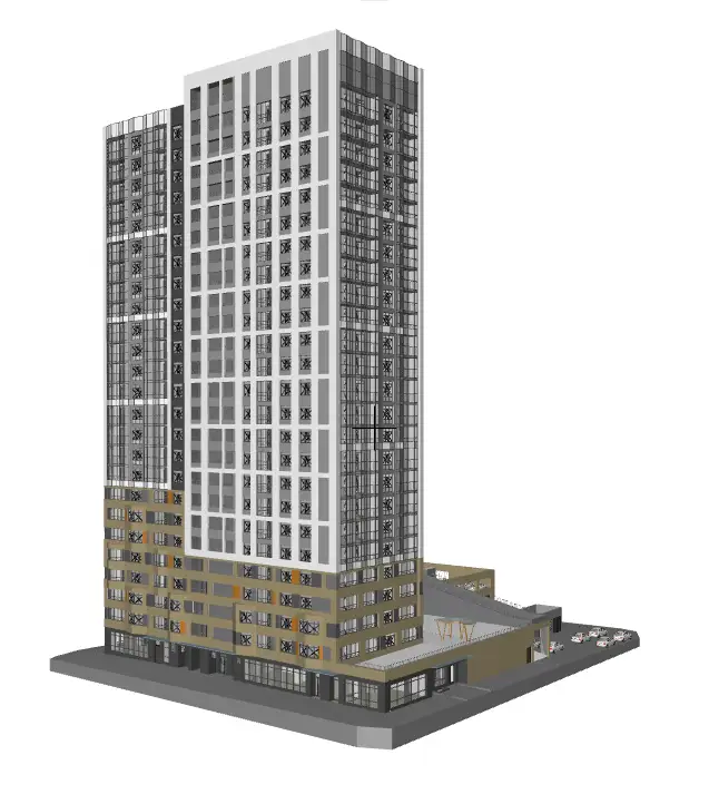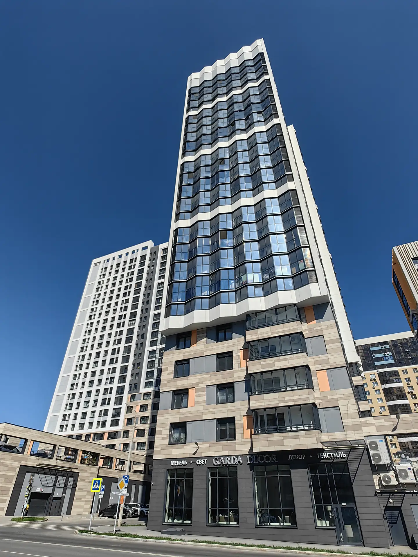 Квартал расположен в динамичной части города с развитой инфраструктурой, в стесненной городской застройке. Нашей задачей стояло сделать двор приватным и безопасным, огородить жильцов от шумных улиц. Таким образом двор поднят на стилобат в уровень второго этажа, а первый этаж предназначен для коммерции и автостоянки.