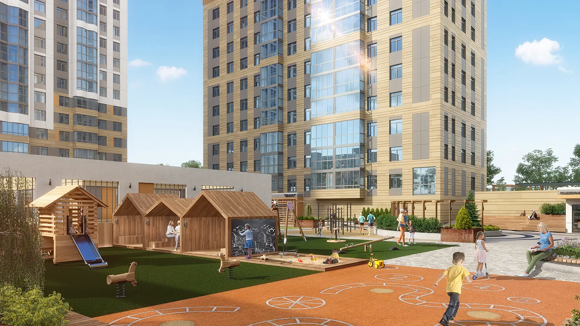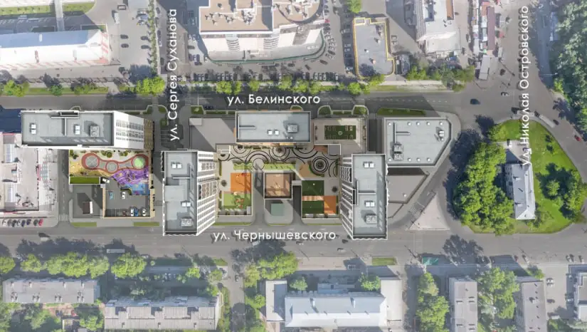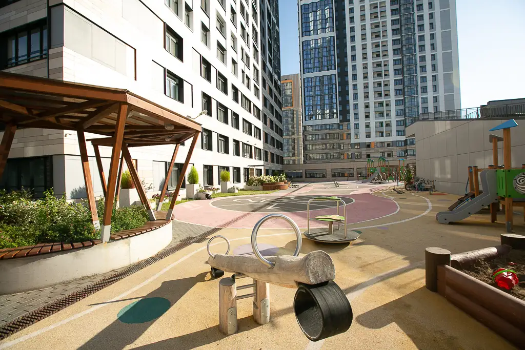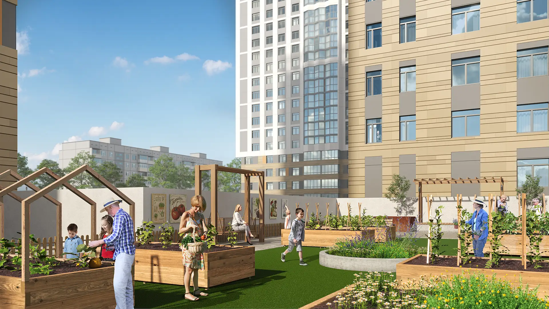 Зоны двора многофункциональны и распределены по возрасту. Для приватных зон отдыха разработаны индивидуальные беседки. Все зоны объединены ярким рисунком покрытия, которое также является элементом игры. Озеленение продумано по сезонам, есть место для однолетних растений, это позволит привносить новизну каждый сезон. Изюминкой является общественный огород — это не просто грядки, а важный элемент инфраструктуры, способствующий коммуникации между жильцами. Здесь, в дружеской атмосфере, за разговорами о садоводстве возникают новые знакомства и сообщества. Пропалывая клубнику или обсуждая особенности ухода за растениями, жители могут отвлечься от городской суеты и насладиться кусочком природы прямо во дворе своего дома.