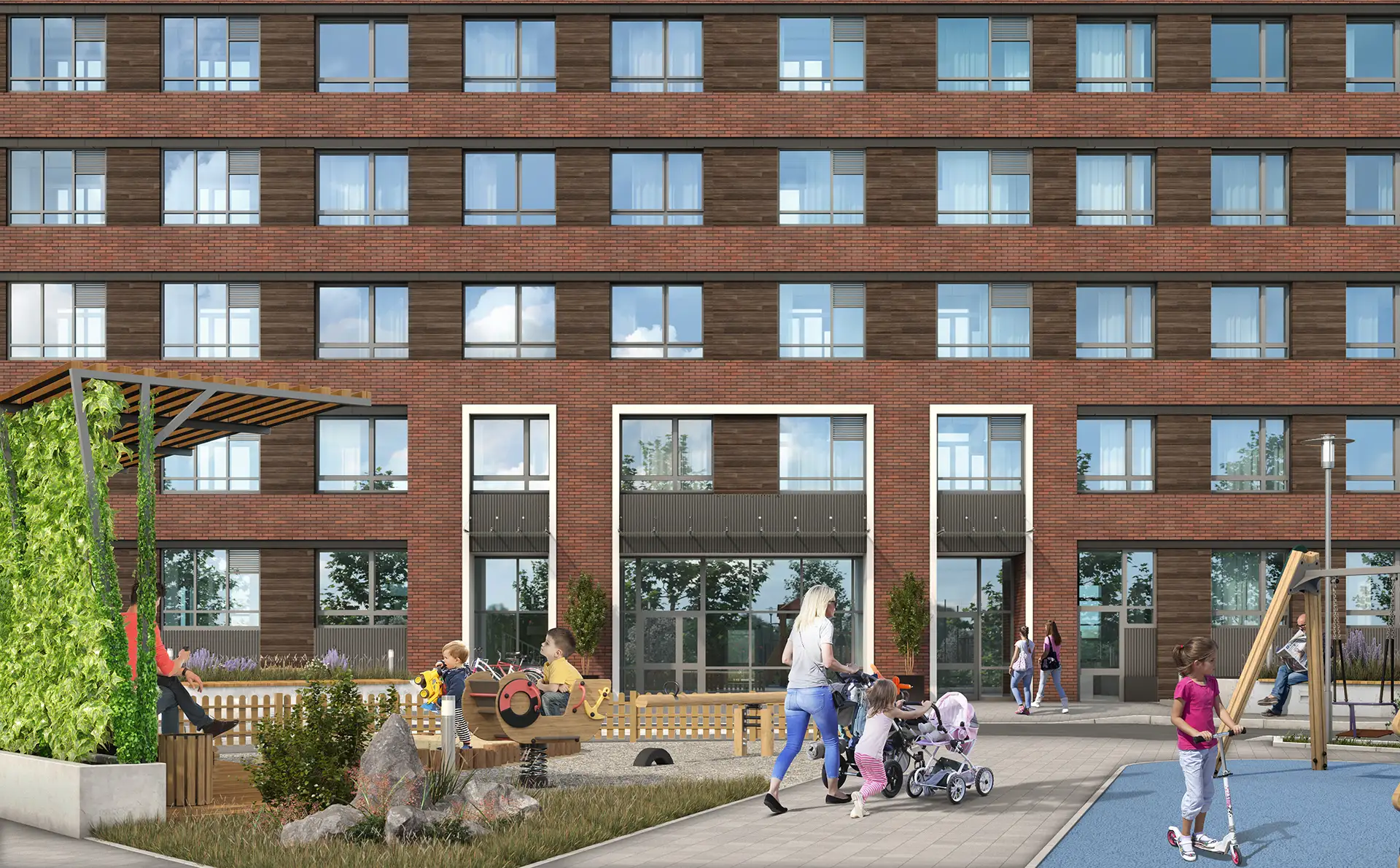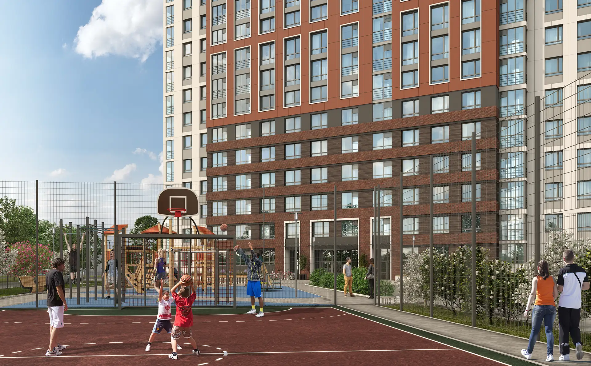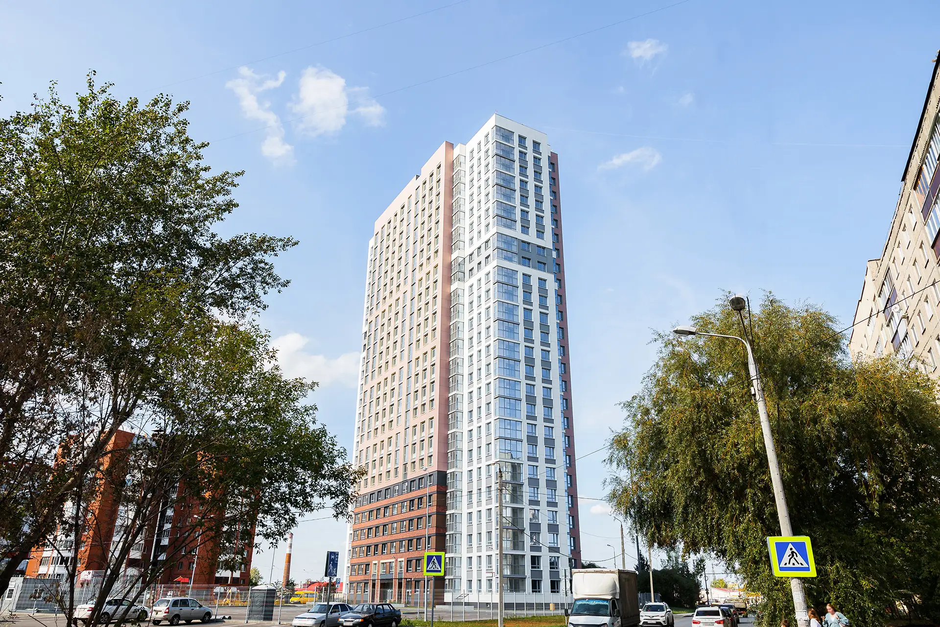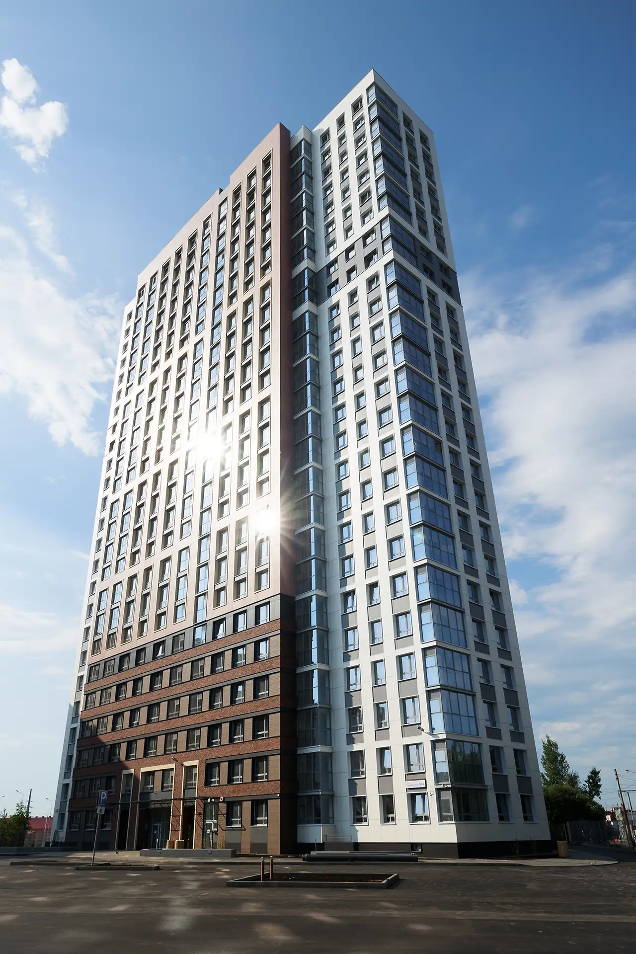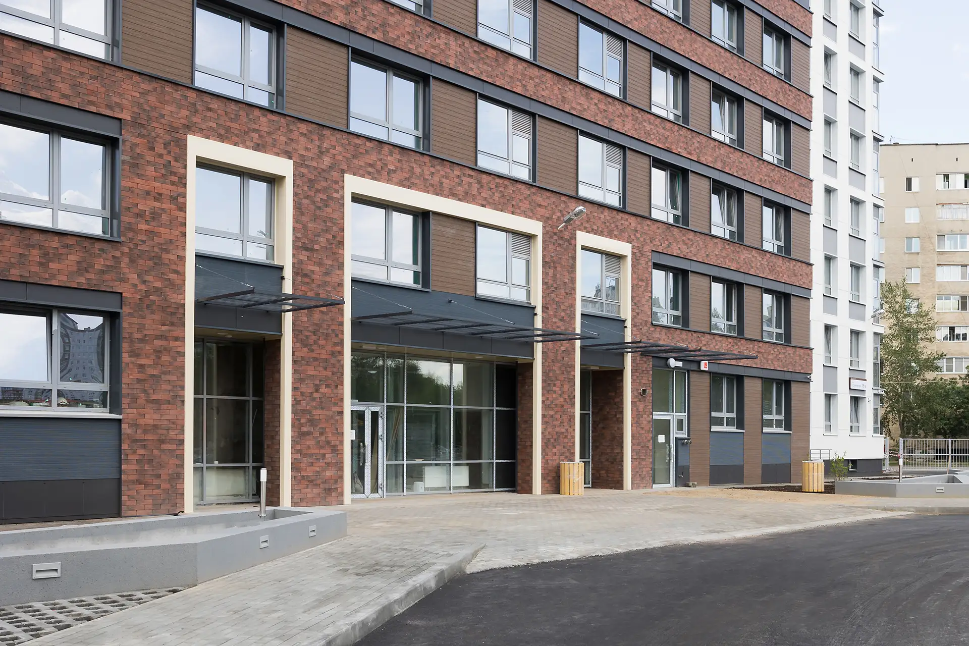 Компактный односекционный объём читается как три вертикали: терракотовый центр собирает силуэт, светлые боковые части формируют пропорции и задают ясный контраст. Для более приятного восприятия архитектуры человеком первые пять этажей облицованы декоративным материалом «под кирпич» с деревянными вставками.
