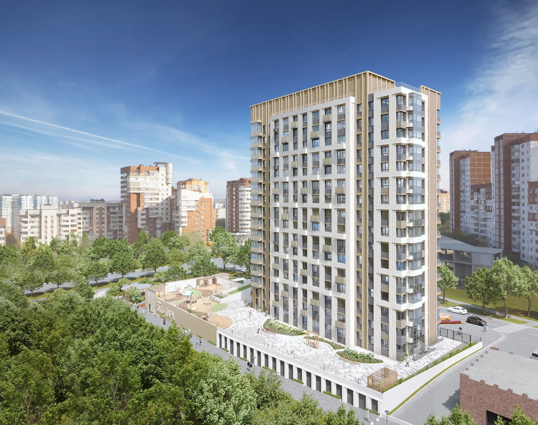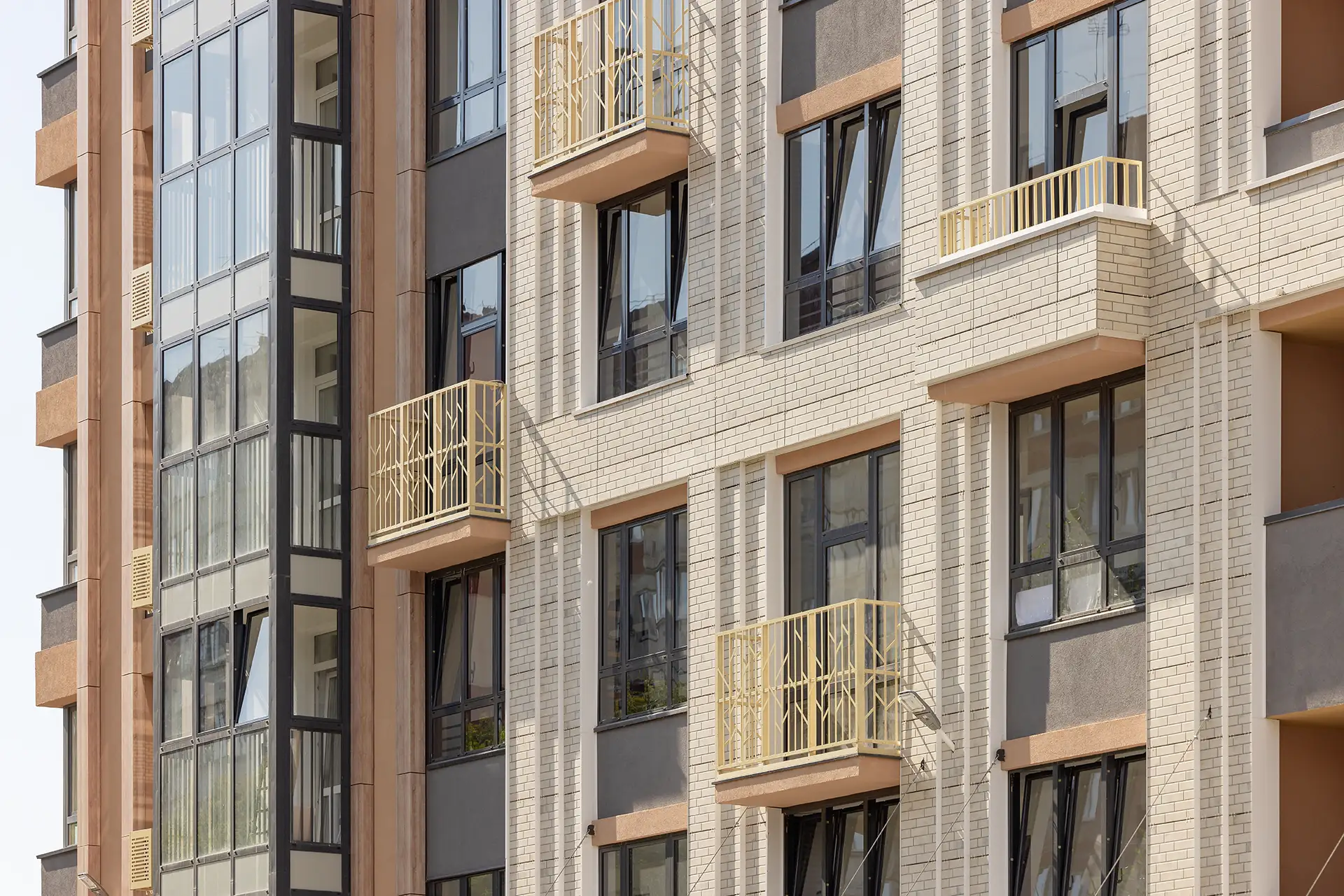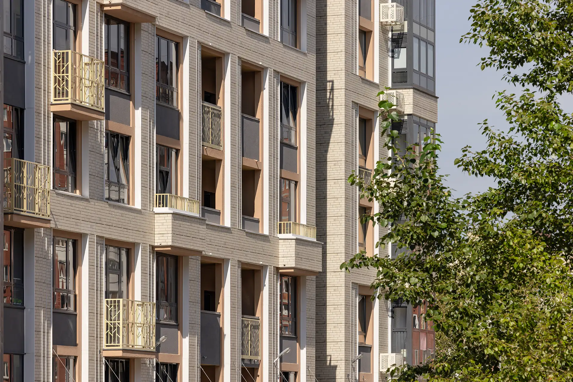 Расположение вблизи с долиной реки Уинка определило внешний вид и эко-концепцию дома. Фасад решен в натуральных цветах - белые и пастельные тона, бежевые и светло-коричневые оттенки, облицовка под дерево, растительные мотивы.