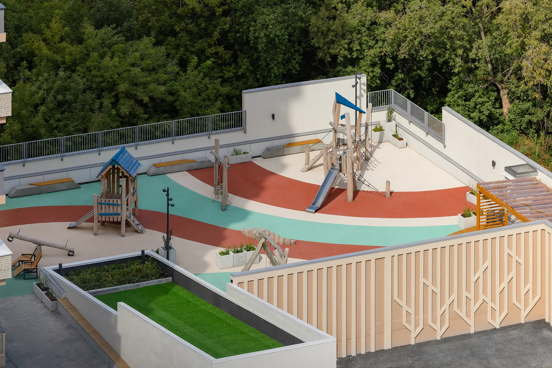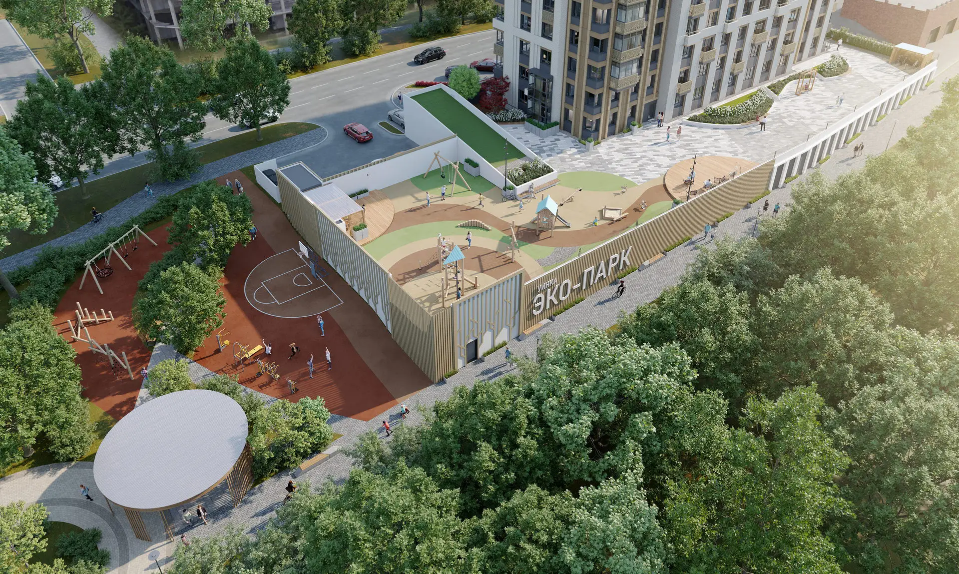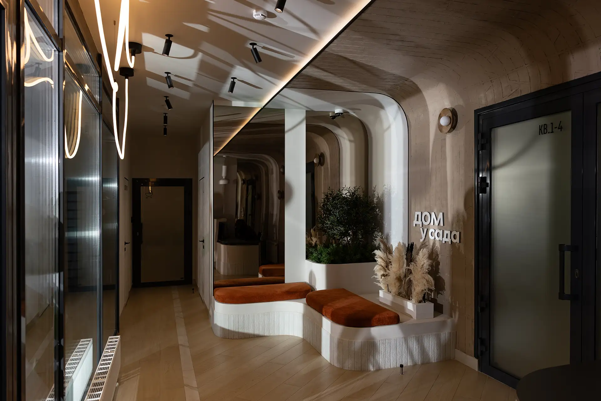 Расположение вблизи с долиной реки Уинка определило внешний вид и эко-концепцию дома. Фасад решен в натуральных цветах - белые и пастельные тона, бежевые и светло-коричневые оттенки, облицовка под дерево, растительные мотивы.