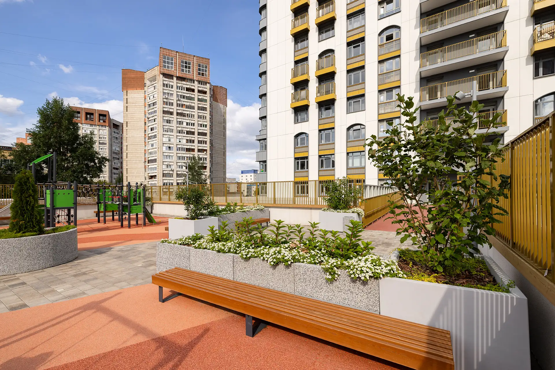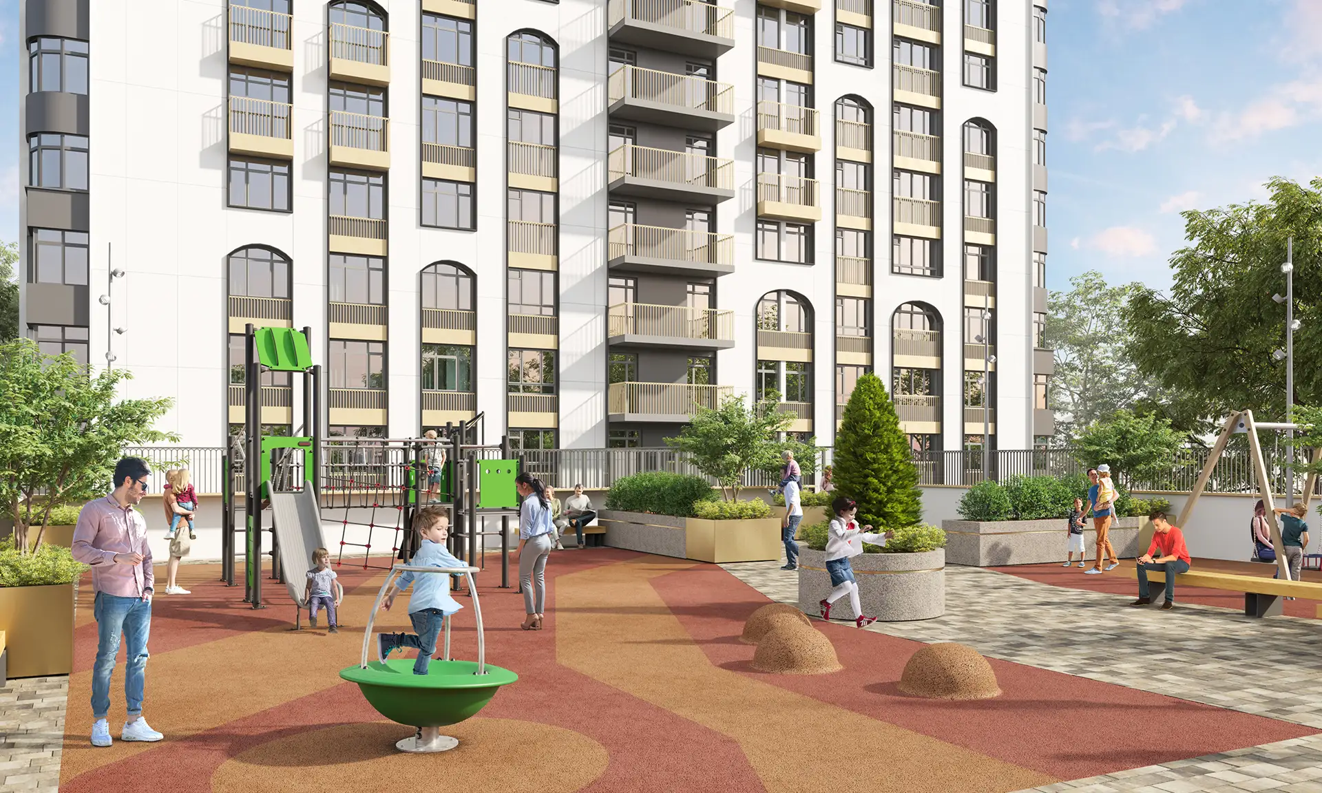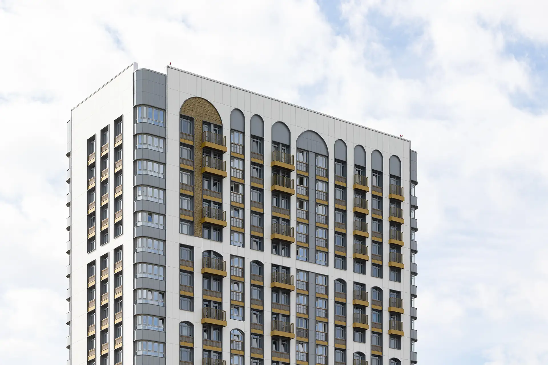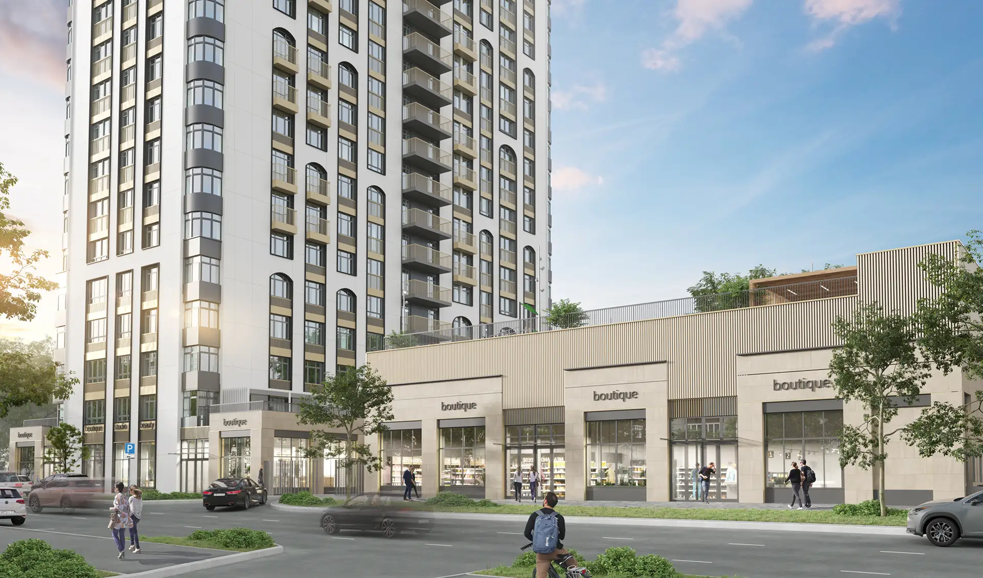 Концепция фасадов выделяет здание среди остальных, за счёт применения арочных проемов и ниш. Это не просто современный тренд в оформлении фасадов, но и своеобразный жест в сторону локации объекта.